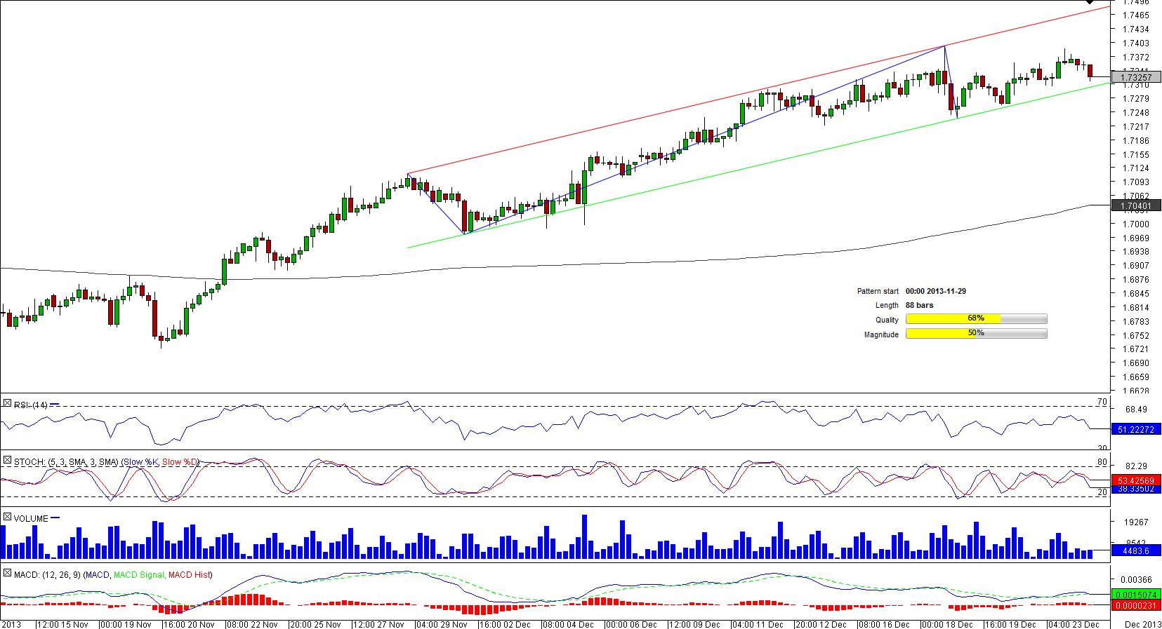 EUR/SGD confirmed its bullish intentions on Nov 22, when it breached the 200-period SMA to the upside. Soon afterwards the channel up (already more than 100 bars long) was initiated.