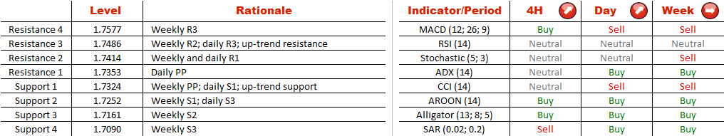 Considering that a majority of the technical indicators on the most relevant time-frames are giving ‘buy' signals and the spot price is right at the lower rising trend-line, which creates formidable support at 1.7324, the short and long-term bias towards the currency pair is strongly bullish. The distribution between the long and short positions, however, reveals that most of the traders (72%) are expecting underperformance of the single European currency relative to the Singapore Dollar.