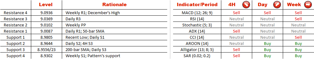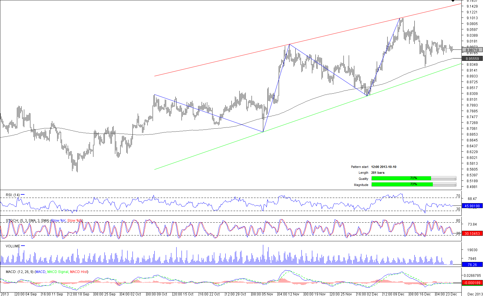 A 281-bar long rising wedge was formed by EUR/SEK on a 4H chart in the beginning of October. Pattern's support has been followed by a 200-period SMA, and each time bears have been experiencing difficulties around the lower trend line. This time the pair is changing hands just 328 pips above the SMA, and according to aggregate technical indicators on a 4H chart, there is a great potential for bears to push the price lower. Nonetheless, in a longer term the appreciation of the single currency versus the Swedish Krone is still likely, as indicators on a daily chart are sending ‘buy' signals, while almost 74% of traders are holding long positions.