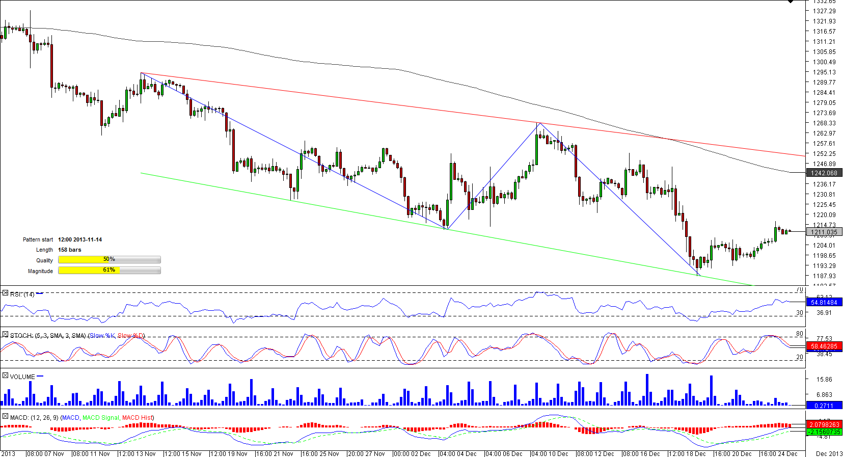 The yellow metal has been retreating since the middle of autumn; however, XAU/USD embarked on formation of the channel down pattern only in November when the precious metal dived below its short and long-term SMAs. The corridor is about 158-bar long and has average quality and magnitude. Lack of fresh data releases during Christmas time mollified selling pressure thus aiding XAU/USD to bounce off the pattern's support and may even help the pair to surpass its 50-bar SMA taken into account that 61.26% of market players are bullish on the pair.