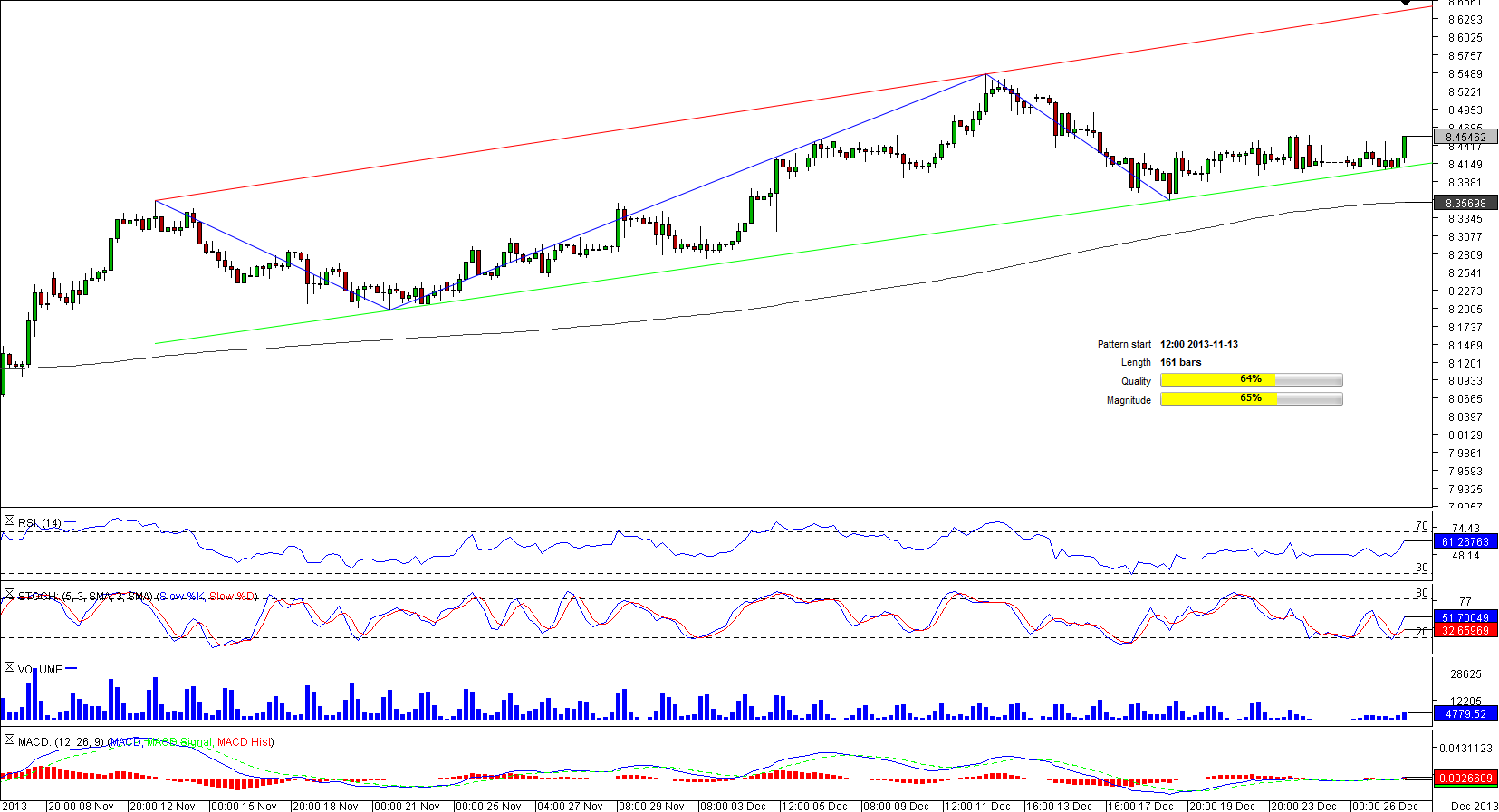Although a strong rally that started two months ago came to a sudden stop in mid-November, EUR/NOK did not lose its bullish momentum and continued to trade above the 200-period SMA and thereby formed a channel up.