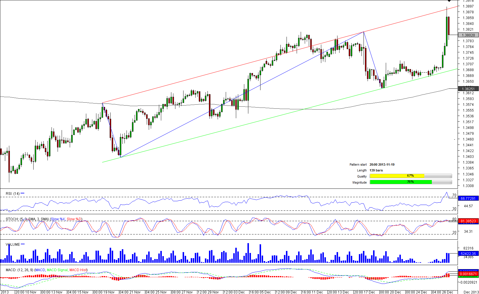The most traded currency pair has been highly volatile on Friday following comments from the ECB. Despite a 205 pips hike, the pair is still moving in pattern's boundaries, however, according to technical indicators on a variety of timeframes, further appreciation is expected. At the same time, traders are less optimistic and opening short positions more often that long ones (65% bearish sentiment). Meanwhile, the single currency is sold in 61% of all cases, while the greenback is bought in 64% cases across the board. The next strong resistance for long traders is located around 1.389-39, represented by pattern's resistance, weekly R2 and a strong psychological level.