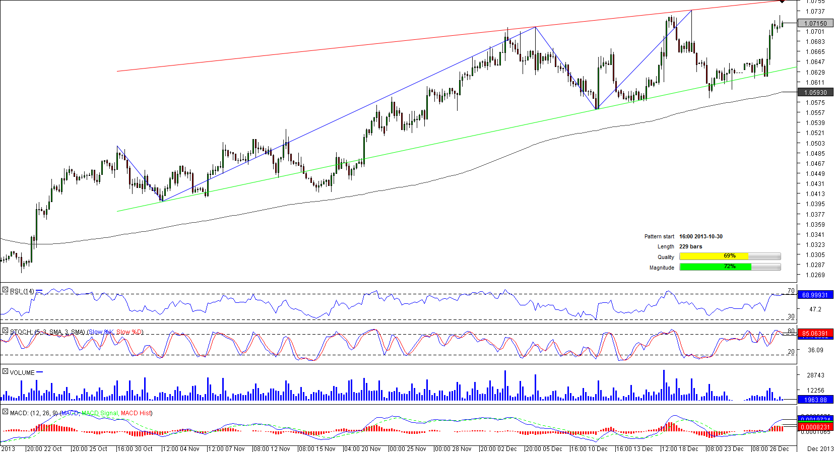 The upside trend that followed October's decline aided USD/CAD to shape a rising wedge pattern that now is almost 230-bar long. Whilst moving within the pattern's limits, the pair managed to attain a four year high of 1.0773 for two times and at the moment of writing the pair was vacillating close to this peak. However, considering the SWFX data, the pair is not likely to extend its gains in the foreseeable future as about 60% of traders are betting on depreciation of the currency couple.