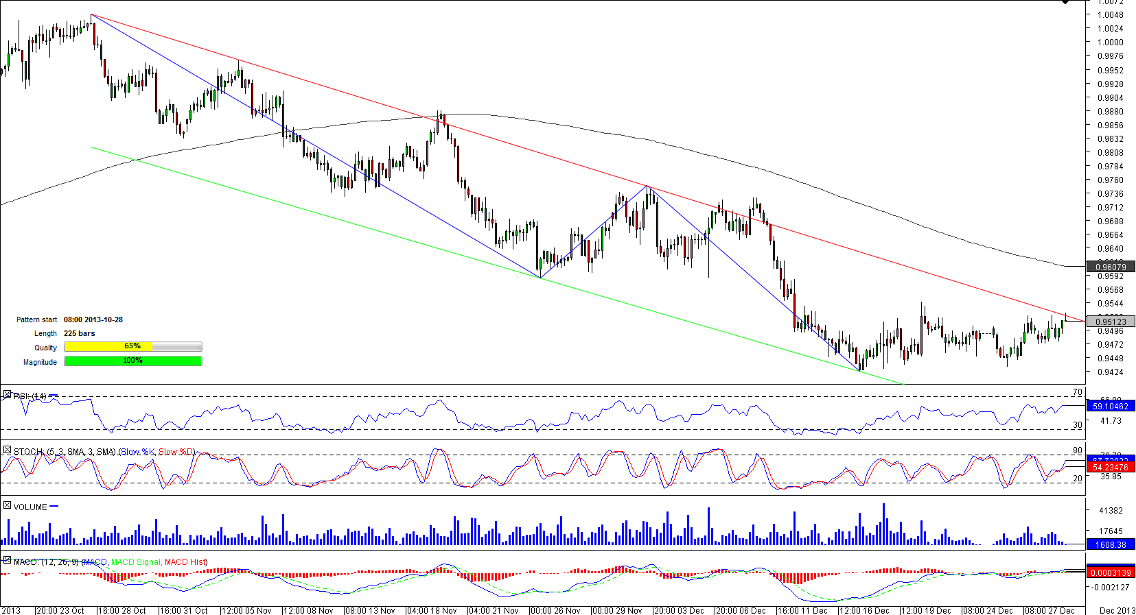 Having attained almost a six-month high in the very end of October, the Australian Dollar started to lose ground against its Canadian peer. The currency pair performed a decline within the limits of the channel down pattern that now is 225-bar long. Currently the pair is vacillating near the upper boundary of the pattern, a proximity to which may result in the breakout. However, this remains questionable as a jump to this level is expected to put a noticeable selling pressure on EUR/CAD given a strong bearishness on the market-84.62% of traders are betting on depreciation of the pair.