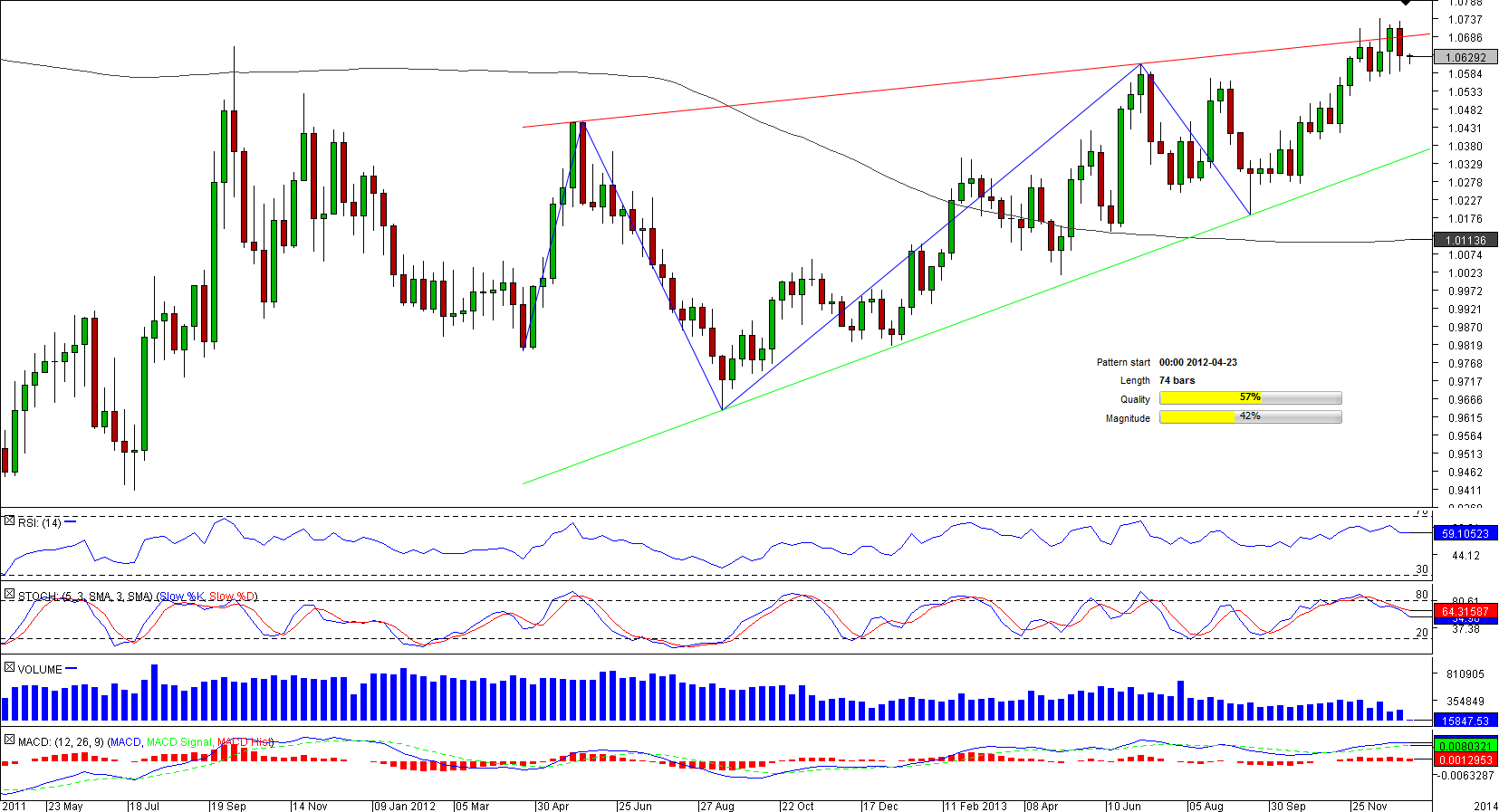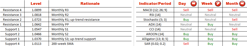 Since June of 2012 USD/CAD has been mostly following a bullish tendency. Throughout this time interval the trading range has been gradually narrowing. As a result, the currency pair formed a rising wedge pattern, which implies that the current recovery may be nearing its end and the rally will soon be reversed, even though weekly technical indicators are mostly giving ‘buy' signals. In the near-term the price is supposed to be bearish—at the moment it is trading just below the up-trend resistance line and the monthly pivot point. The expected decline may be stopped by the rising support at 1.0370, but in the longer-term perspective it is likely to be breached.
