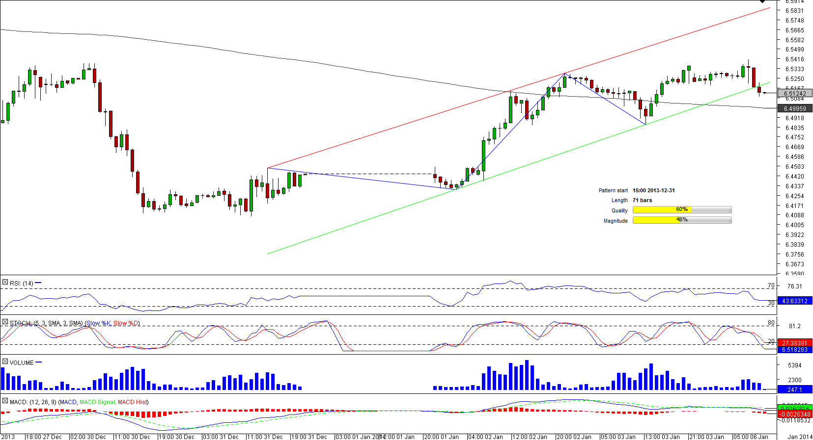 While the recent price action of CAD/HKD is presented here as an emergence of the rising wedge pattern, there is a strong argument in favour of the formation of the ascending triangle, being that the slope of the upper boundary is fairly low and may in reality be flat circa 7.3080. Accordingly, it is more reasonable to use the recent