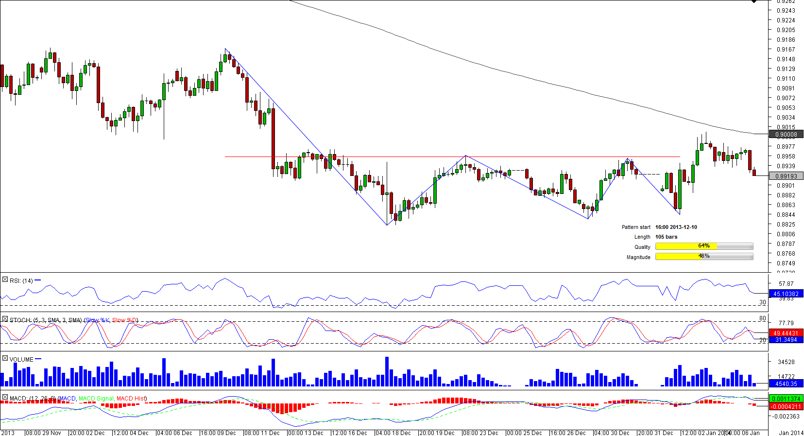 The Australian Dollar has been losing ground against its U.S. peer since mid-October and in the first part of December the pair embarked on a formation of the triple bottom pattern that took the currency couple to a five-year low of 0.8821. AUD/USD neared this low for three times and now it entered the bullish phase of the pattern; in other words, it breached both the 50-bar SMA and pattern's resistance that was expected to provoke a sharp advance. However, the pair did not manage to sustain the fast pace of appreciation and was forced to come back to the 50-bar SMA, near which it is likely to trade in the hours to come.
