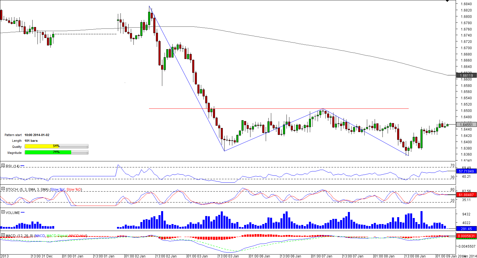 Now the currency pair is recovering after hitting an eight-week low for the second time, implying that a continuous advance may lie ahead. However, the advance may be constrained by a formidable resistance represented by the pattern's neck-line at 1.6505.