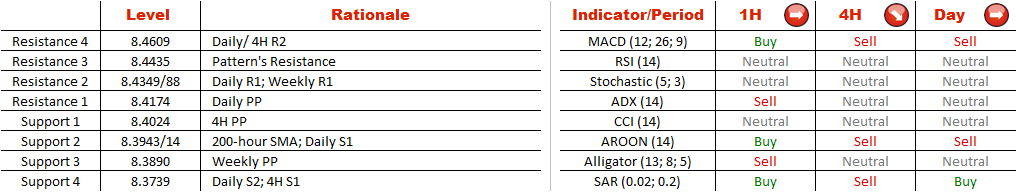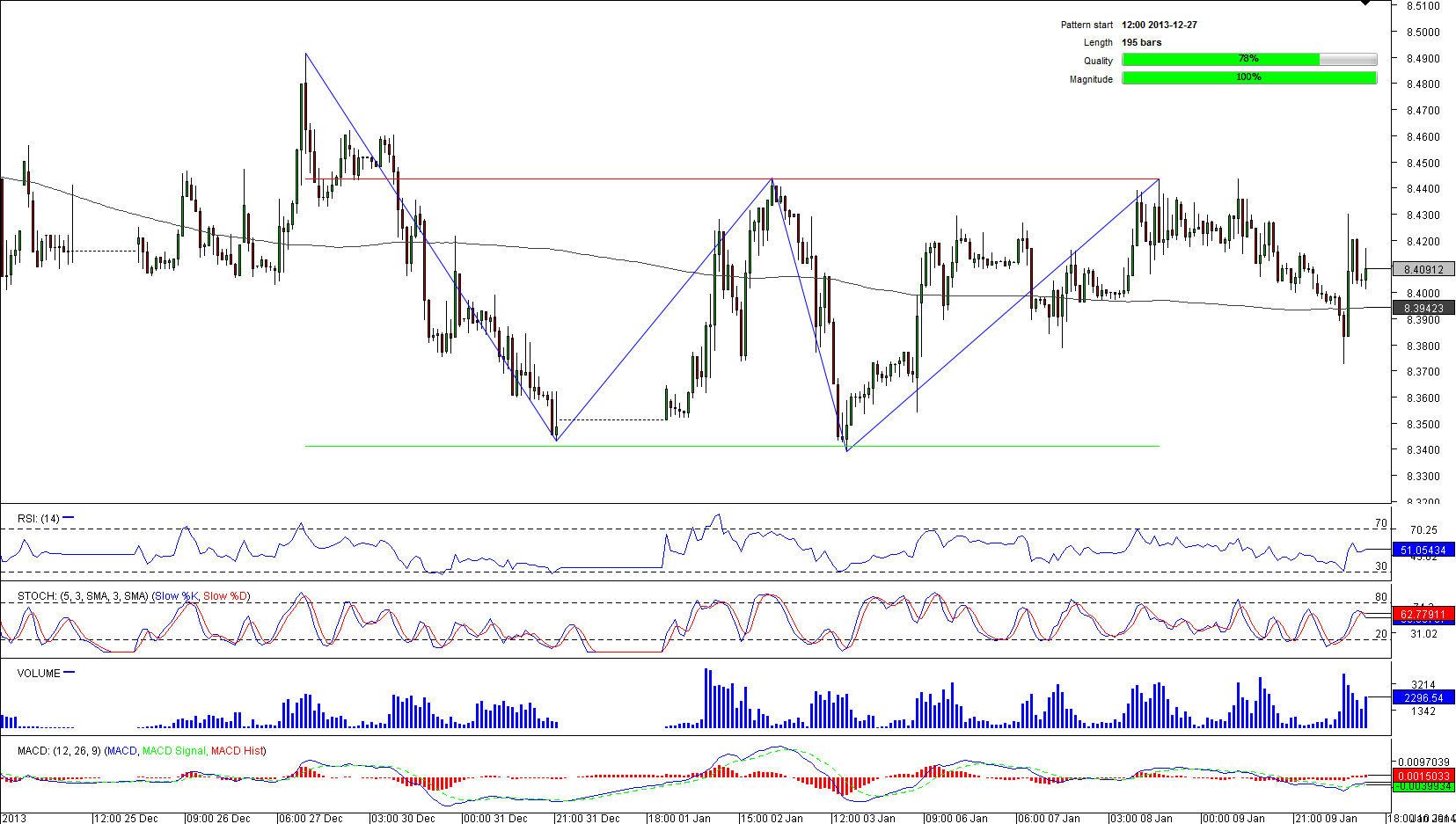 The Euro– Norwegian Krone cross has been moving sideways since late December, and it seems that the tendency will persist for some time before the pair will be able to push above or below any of the trend lines. Nonetheless, a move below the 200-period SMA seems probable, as aggregate technical indicators are either neutral or sending "sell" signals, while 72% traders were holding short positions. It is hard to predict, whether bears will be able to push the pair any lower, as just 53 pips is located a weekly pivot and a Bollinger band. Moreover, a recent low, daily S2 and 4H S1 can be found around 8.3739, therefore, a movement to the south is expected to be limited.
