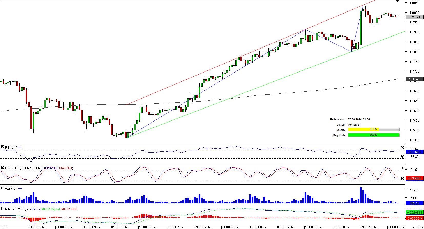 The British Pound performed a sharp appreciation against the Canadian currency in early January; however, the advance was paused several hours earlier when the pair touched a five-year high of 1.8032 that lies on the upper boundary of the 104-bar long channel up pattern. In the hours to come GBP/CAD is likely to restart its climb as 68.25% of traders are bullish on the currency couple. Furthermore, technical indicators also are pointing to a possible rise before long.