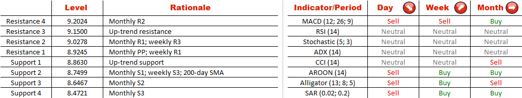 Judging by EUR/SEK's behaviour over the past year, it becomes evident that the currency pair has been trading in a rising wedge pattern. Since mid-January of 2013 the trading range of the exchange rate has been narrowing, while the Euro was appreciating relative to the Swedish Krona. EUR is therefore inclined to fall precipitously once the up-trend support gives in. At the moment the price is testing the lower boundary of the figure at 8.8630. If this support is breached, the decline is likely to aim for 8.7499—the current location of the monthly S1 and the 200-day SMA. The next target could be 8.6467, which is the monthly S2 level and also designates one of the recent lows.
