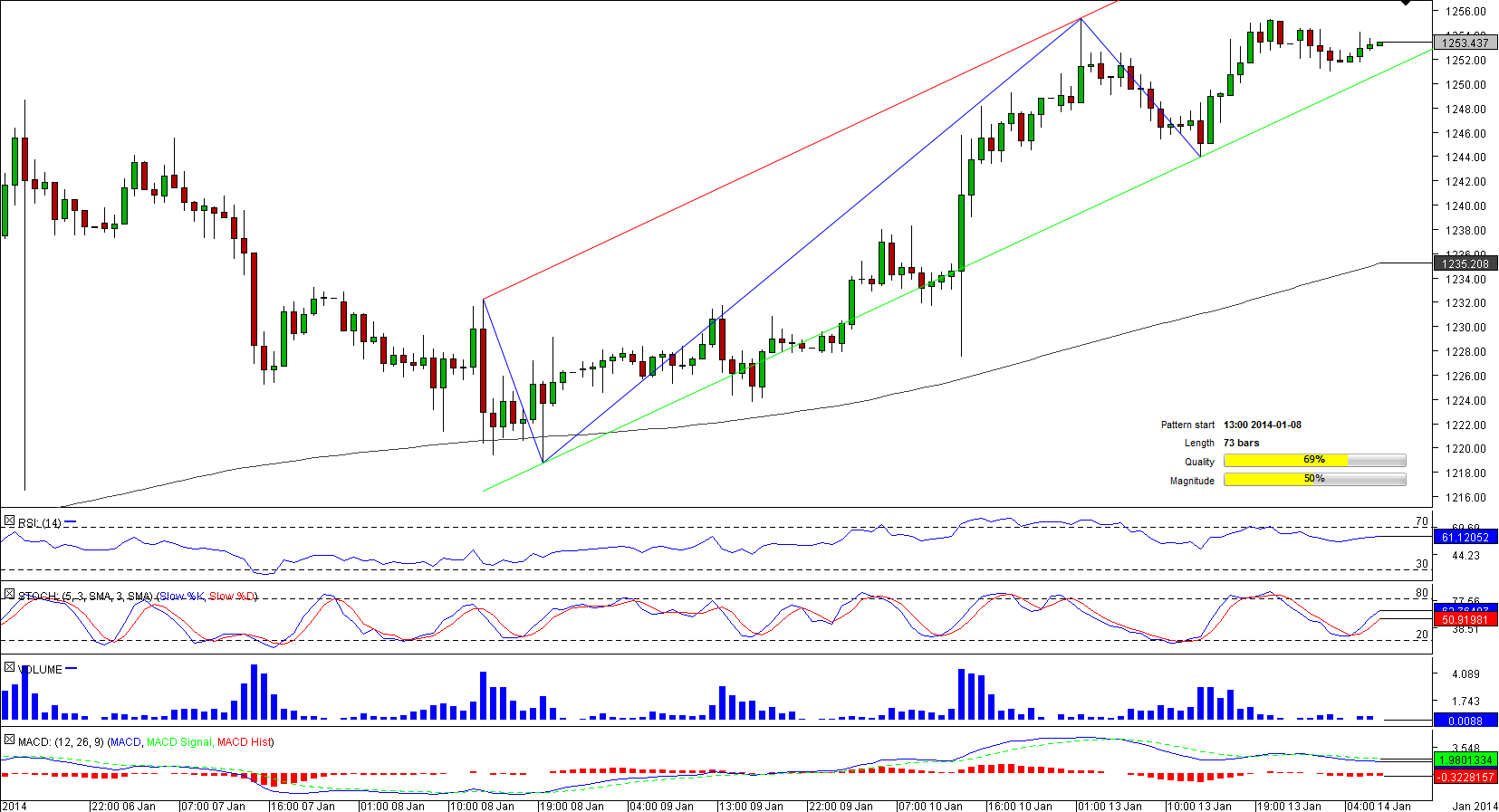 The most popular precious metal is attempting to rebound after severe losses in the last trading sessions of 2013. After a dive below the psychologically important level of $1,200 per ounce in the New Year's Eve the yellow metal changed direction and on January 8 XAU/USD embarked on formation of the channel up pattern. The corridor now is still relatively short, only 73-bar long, but it has high chances to be continued. Market sentiment is strongly bullish, with 72.10% of market participants betting on a further climb of the bullion, moreover, technical indicators are sending bullish signals for short, medium and long terms.