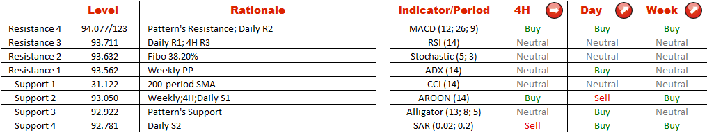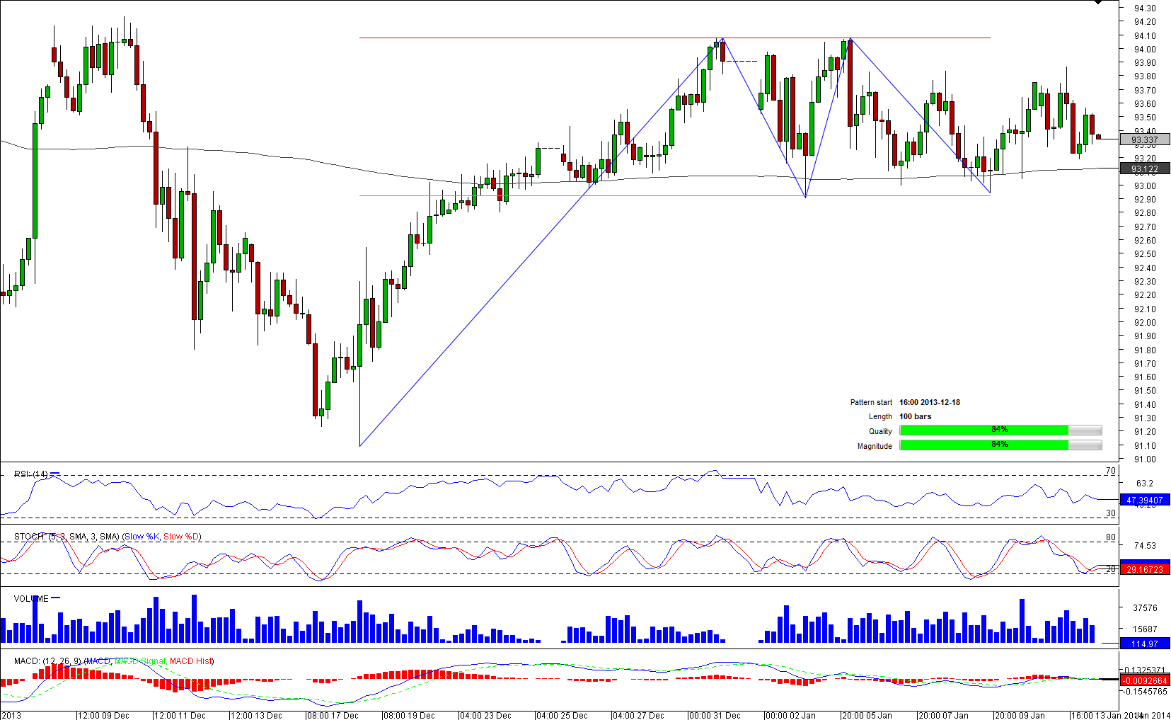 After crossing 92.923 on December 23, AUD/JPY entered a period of consolidation and since than has been moving sideways. There have been four touching points, however, neither of sides was able to push the pair above or below the trend line. As soon as the breakout occurs the pair can be highly profitable for traders, as both quality and magnitude are above the average values. While short-term technical indicators are suggesting a dip towards 200-period SMA, market sentiment (57% bullish), pending orders (58% to buy in a 100-pip range) as well as technical indicators on a daily and weekly charts are pointing at a move to the north, putting pattern's upper boundary on the map.