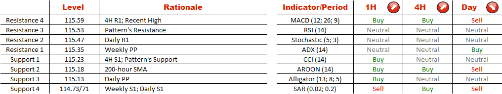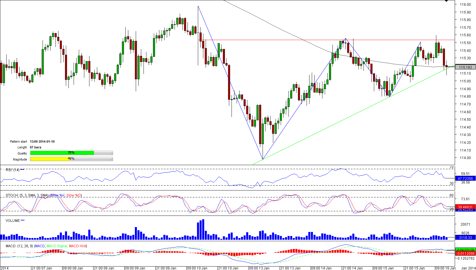 CHF/JPY will be highly volatile soon, as both trend lines will converge on Friday, January 17. At the moment of writing the pair was changing hands at 115.18, level represented by pattern's support and 200-hour SMA. It is unlikely that this level will be breached, and the pair is expected to bounce back and head towards pattern's upper boundary. This idea is supported by technical indicators on a hourly and 4H charts. In a longer term, however, aggregate indicators are pointing at pair's depreciation. At the same time, traders are betting on a downside breakout, as almost 74% of them are holding short positions. Nevertheless, a move to pattern's resistance can be expected.