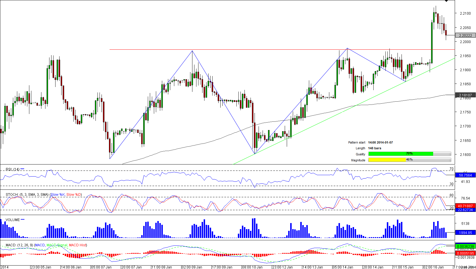 USD/TRY cross is one of the most attractive pairs for traders right now. The pair has breached pattern's resistance, and after rising almost 150 pips, pulled back to pattern's support. This move is called a throwback, and it represents the great entering point for long traders. Moreover, technical indicators on a hourly and 4H are sending "buy" signals, supporting the case of further appreciation. As we assume the pair will move to the north, then it is worth paying attention at pending orders. Vast majority (87.50%) of traders are ready to buy the greenback against the Turkish Lira. The next important level for long traders is located at a recent high and weekly R2 at 2.2120.
