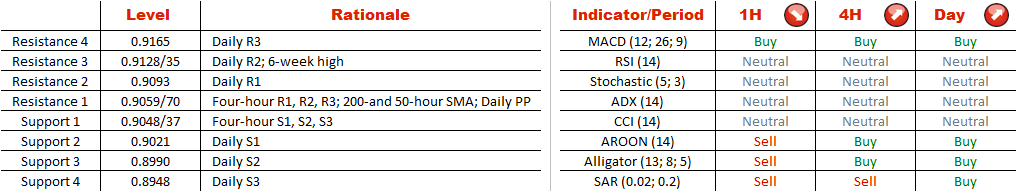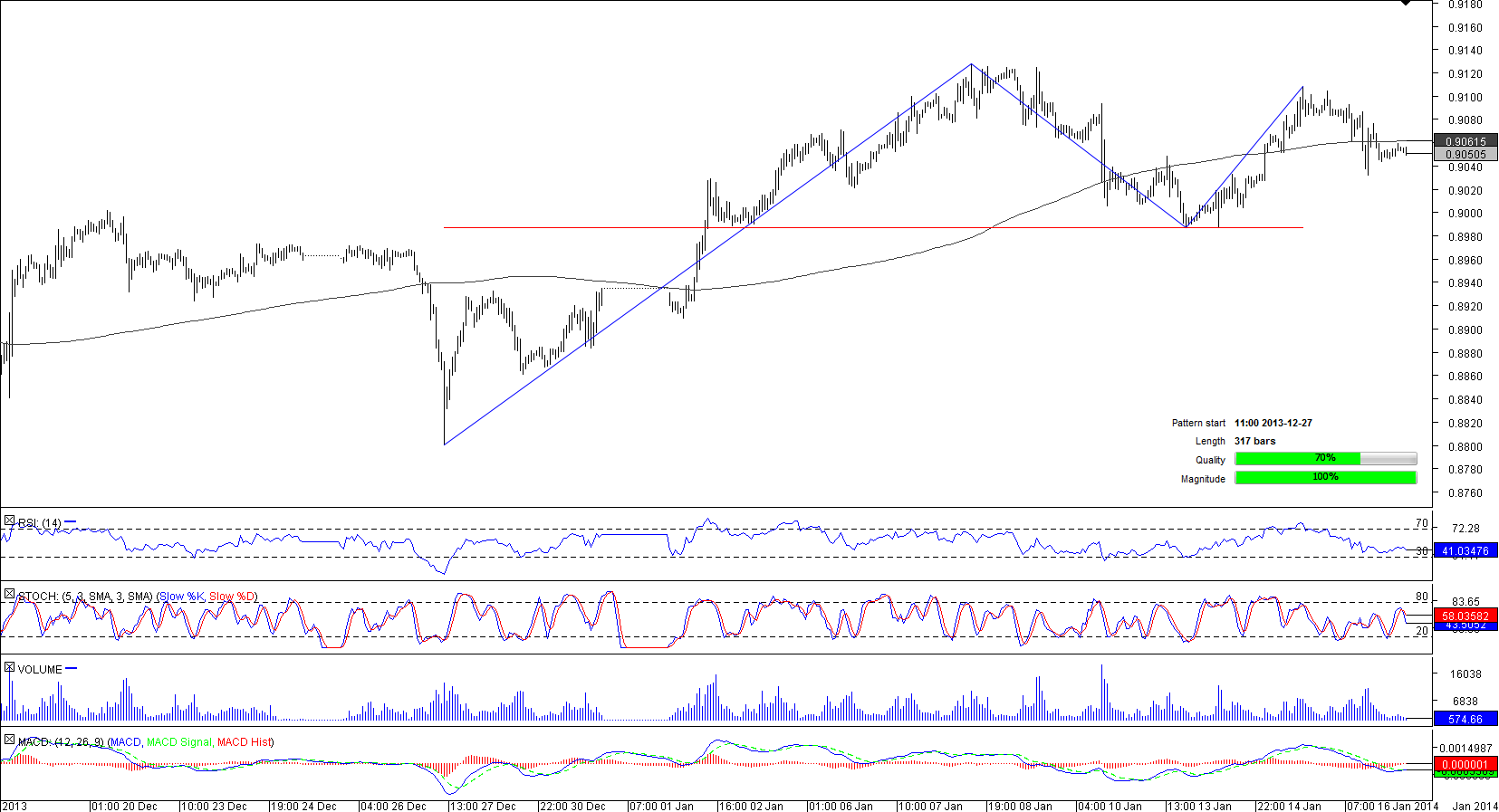 The double top pattern shaped by USD/CHF has almost ideal trajectory and is more than 310-bar long. The first peak, the highest one, is lying at six-week high of 0.9128, while the second one is slightly lower at 0.9109.