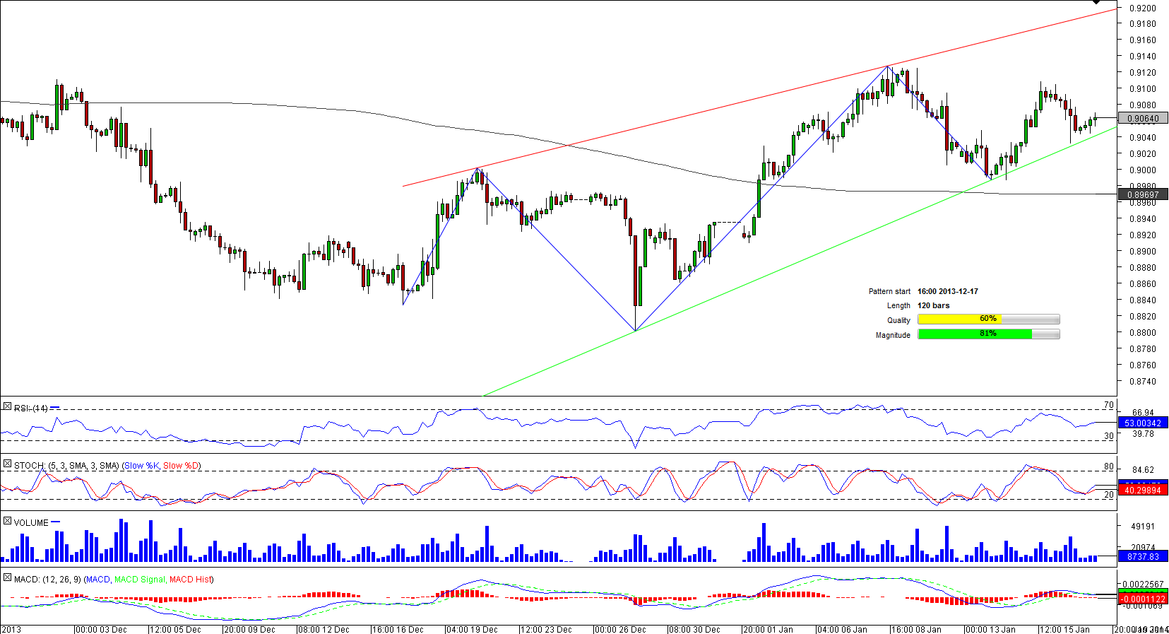 Nonetheless, there are already several signs that the bullish momentum is weakening and is about to come to an end. The main indicator is the rising wedge pattern that the price has been forming for the past 20 days. Usually in this case we would expect the rate to breach the lower boundary of the figure and plummet down to 0.8976 or even 0.88. Moreover, while the four-hour and daily studies are bullish, the weekly indicators are suggesting that the longer-term perspectives are in favour of a decline.