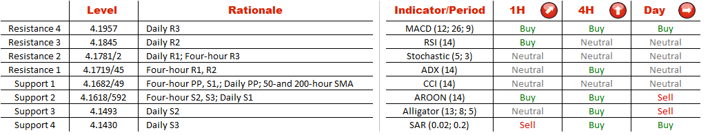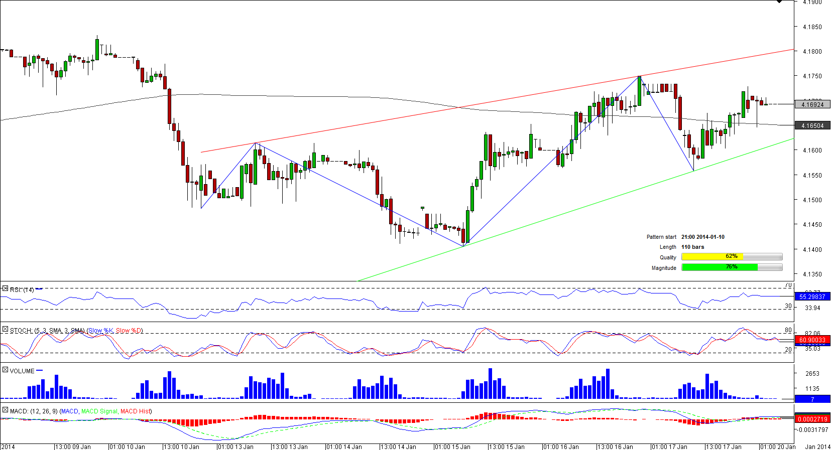The common currency has been rallying against the Polish Zloty for 110 hours; the rally took place in the area bounded by two gradually converging, upward sloping lines. Recently, the currency couple rebounded to 4.1749, the level at which the decline that led to a formation of the rising wedge pattern started in early January.