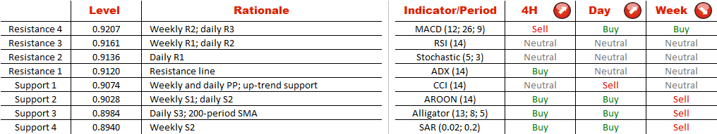 Accordingly, even though the four-hour and daily technical indicators are bullish, given the long-term negative bias towards the pair, it is more likely to breach the rising support line at 0.9074 and target 0.8984, after which the Dollar will be expected to re-test the December 27 low.