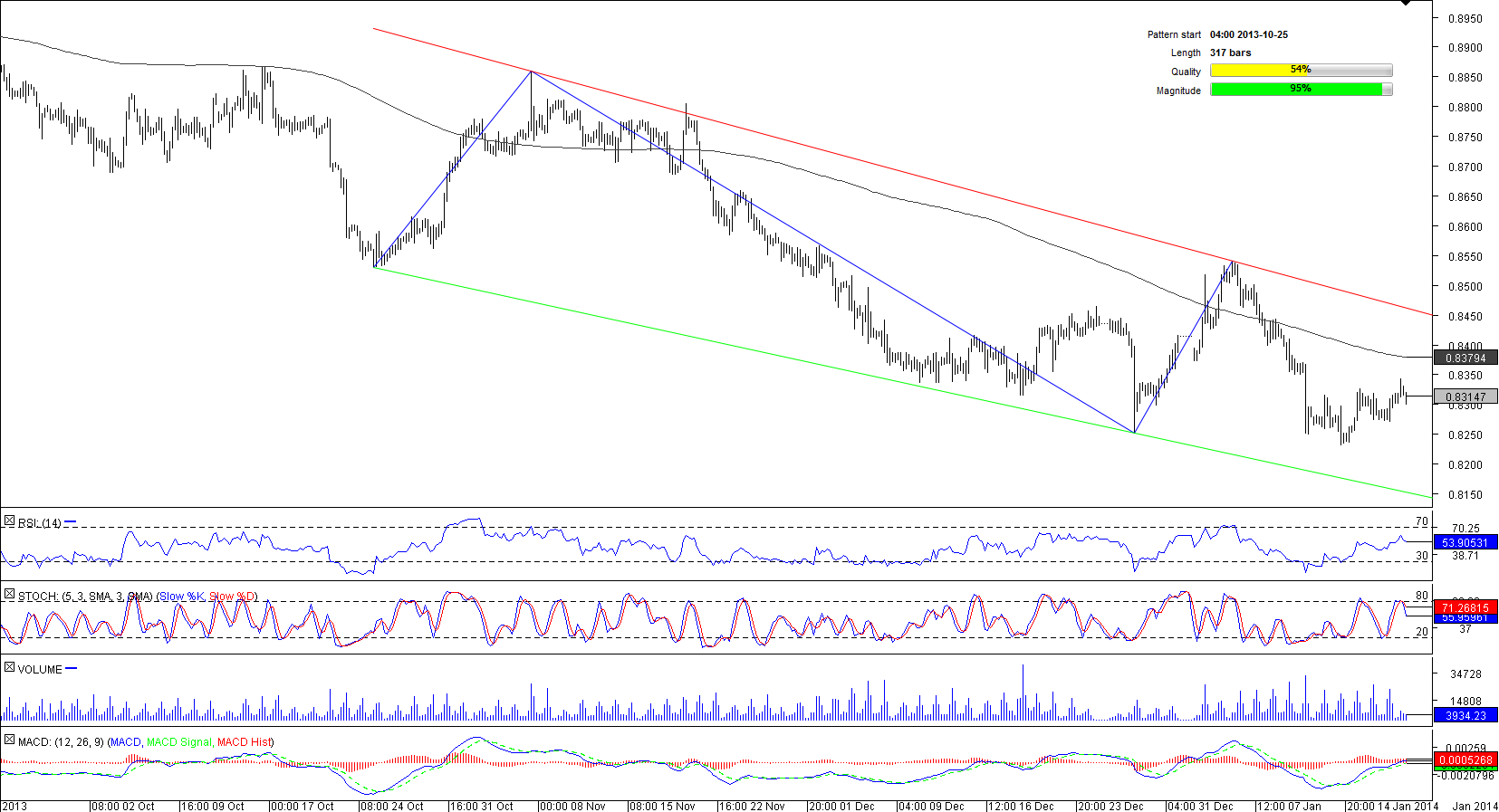 Since August of 2012 the Canadian Dollar has been consistently underperforming relative to the Swiss Franc. As a result, there is a bearish channel currently emerging on the four-hour chart of CAD/CHF.