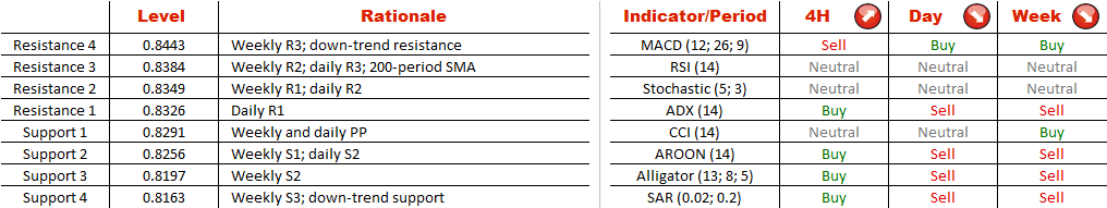 Still, considering the techncial studies and the most recent price action, the pair may rise up to the 200-period SMA or even the upper boundary of the pattern at 0.8443, before finally giving in to the selling pressure and plummeting through the nearest supports to the down-trend line at 0.8163, which is reinforced by the weekly S3 at the moment. Meanwhile, there are slightly more long positions (57%) open in the SWFX market than there are short ones (43%).