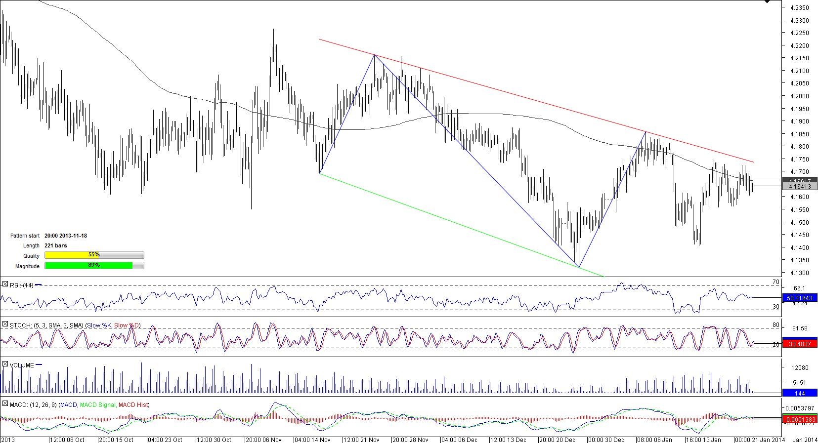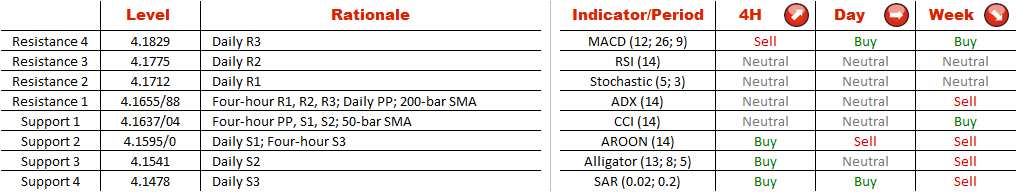 For the last four trading sessions the pair has been faltering close to the upper boundary of the pattern but any attempts to reach this limit were fruitless as the 200-bar SMA sitting at 4.1661 represented a formidable barrier for the pair. According to the SWFX data, the pair may see some strength in the nearest term but may come under selling pressure in a longer perspective.