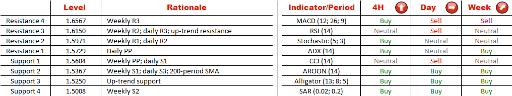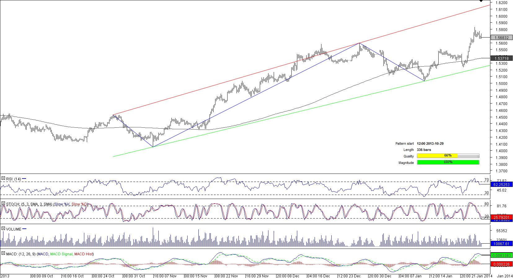 Since the beginning of last year's November the single European currency has been generally outperforming the Aussie, leading to emergence of the upward-sloping channel on the four-hour chart. Right now EUR/AUD is moving away from the demand area around 1.5376, which is mainly created by the long-term moving average and the up-trend support line. Judging by the technical indicators, the currency pair is likely to find support at 1.5604 and resume advancement towards 1.62, where it is supposed to encounter the weekly R2 and the up-trend resistance line. However, most of the traders expect the Euro to depreciate—66% of positions are currently short.