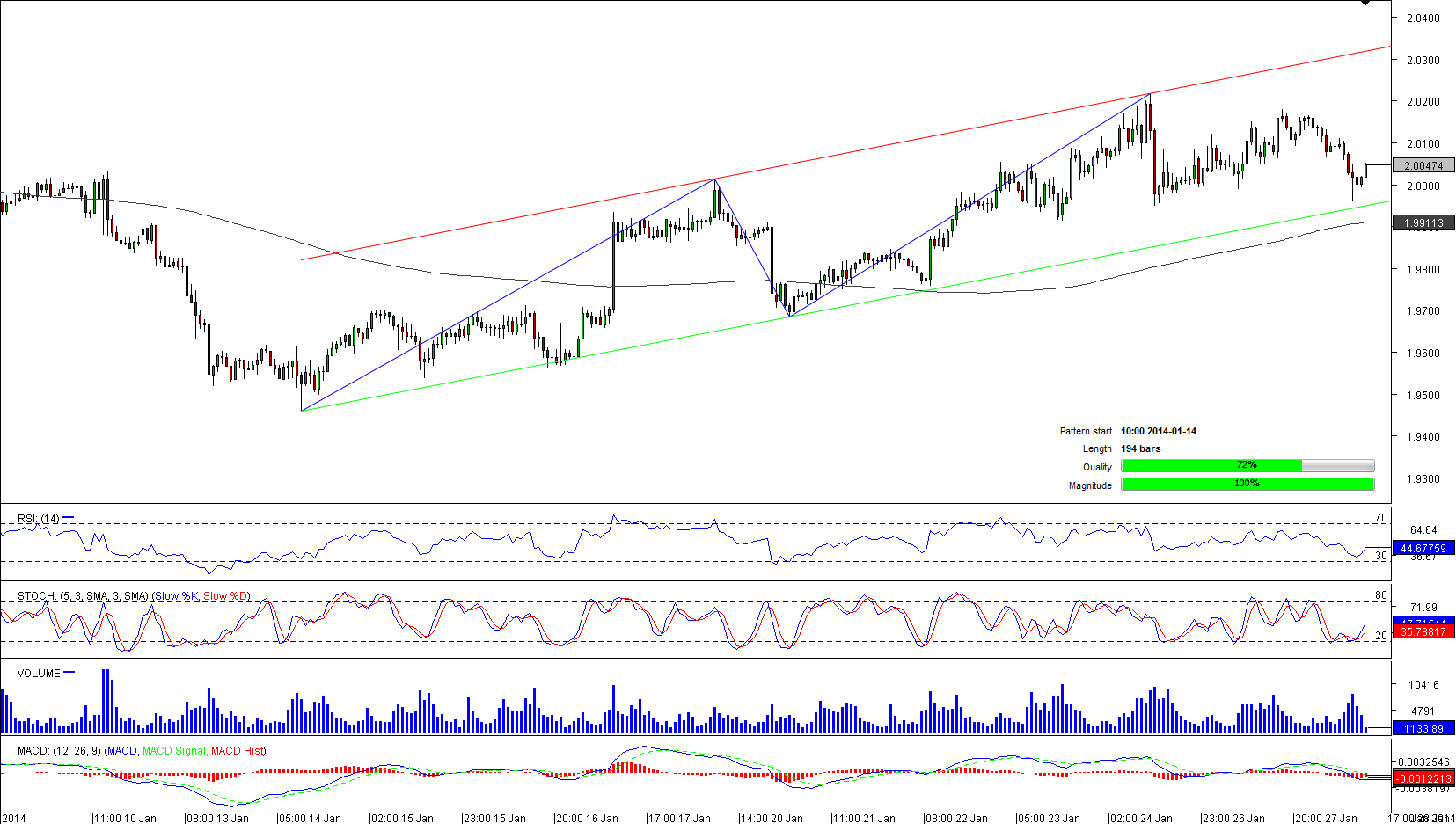 A 194-bar long channel up was formed by GBP/NZD on January 14 and so far the pair has been perfectly moving in pattern's boundaries. On Tuesday the pair was strongly bearish, following a report from the ONS that showed U.K. GDP data, the pair moved closer to the lower boundary, and, according to technical indicators, it will be able to reach it. Market sentiment is not clearly marked, as just 57% of opened positions are long. Vast majority of pending orders, however, is placed to sell the pair and taking into account the fact the Pound is sold in 63% of all cases across the board, a move towards pattern's support seems to be realistic. First key level, however, is located at 2.000.