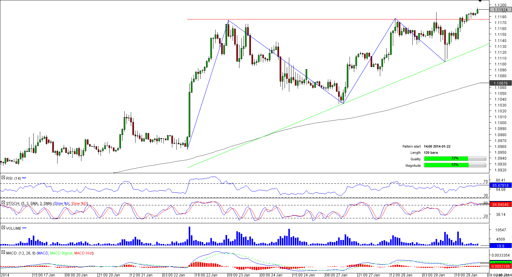 The upper boundary of the pattern that lies at the five-year high of 1.1175 failed to contain the advance of USD/CAD that recently has surpassed this formidable resistance, suggesting that that an accelerating appreciation lies ahead. However, traders remain sceptical about continuation of the rally, with 60.61% of them being bearish on the pair. Meanwhile, technical indicators gainsay traders' opinion, sending bullish signals for the medium-term.