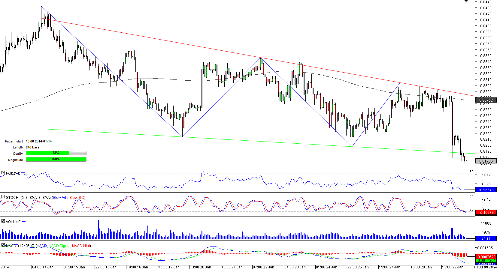 NZD/USD started to shape a falling wedge in mid-January when it hit a three-month high of 0.8432. Since then the New Zealand Dollar has been gradually losing ground versus its U.S. counterpart; however, the pace of depreciation may even accelerate in future given that the pair dived below the lower boundary of pattern a few hours ago. Now NZD/USD represents a lucrative opportunity for market players as the breakout is likely to appear real; according to the SWFX data, the proportion of short positions to the total number of placed orders is almost 60%.