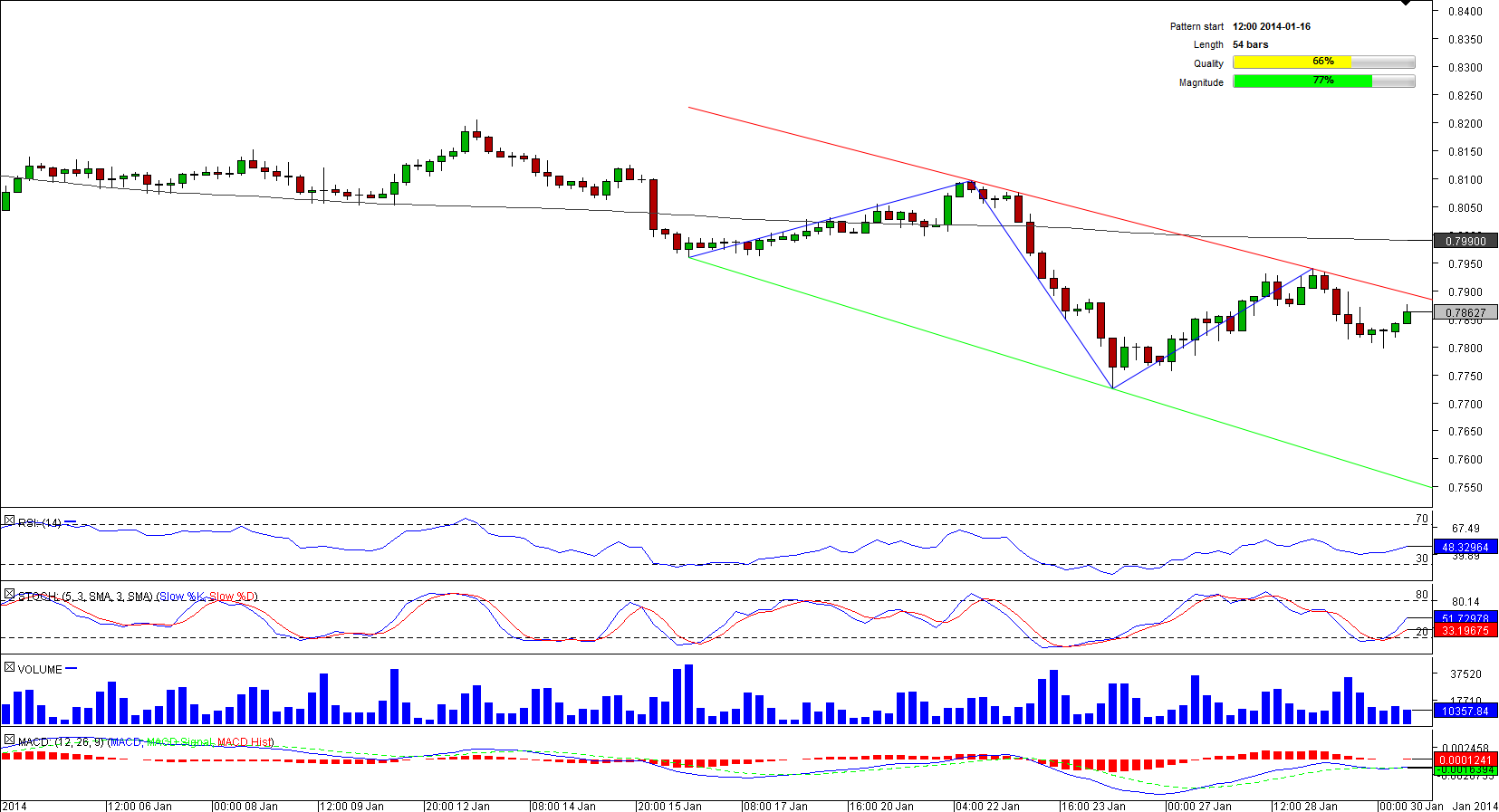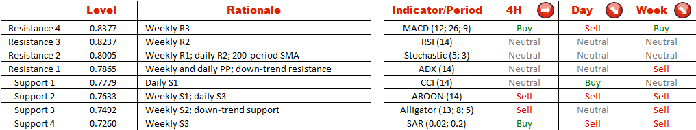 Although for some time the 200-period SMA was able to keep the exchange rate afloat, eventually the bears pushed through the support and started a sell-off that later on turned into a downward-sloping channel. This implies that AUD/CHF is highly unlikely to rise above the falling resistance line at 0.7865 in the nearest future. Instead, the Australian Dollar is expected to confirm this level as an intermediate ceiling and start moving towards the lower edge of the pattern at 0.7492, where it merges with the weekly S2. Moreover, most of the weekly and monthly technical indicators support this idea. However, the sentiment is strongly bullish—at the moment 74% of open positions are long.