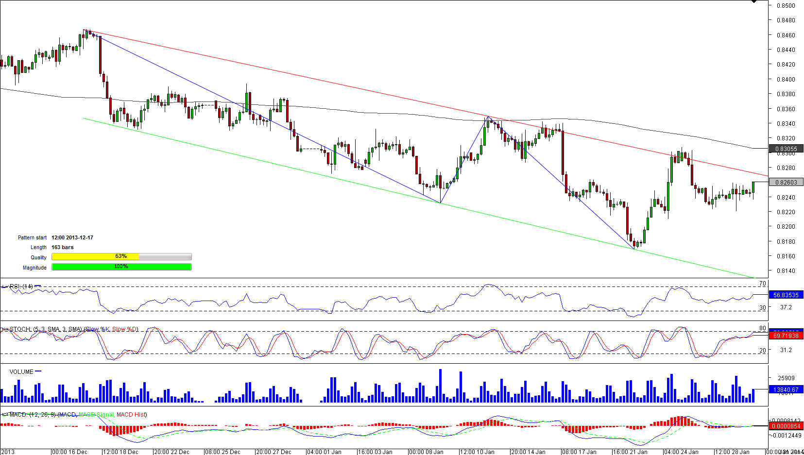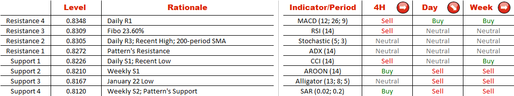 The EUR/GBP currency pair has been moving in boundaries of a channel down pattern since the middle of December. Despite a recent bullish movement and an attempt to break the upper trend line, the outlook is still bearish. Market sentiment is not clearly marked, as the number of short and long positions in almost equal. Technical indicators, however, are suggesting the pair will depreciate, and according to MACD and RSI on the 4H chart, the latest rally to the north is losing steam. Moreover, trading volumes are decreasing, therefore, the pair is expected to hear towards a weekly support at 0.8211, while the key level is located at a recent low at 0.8167.