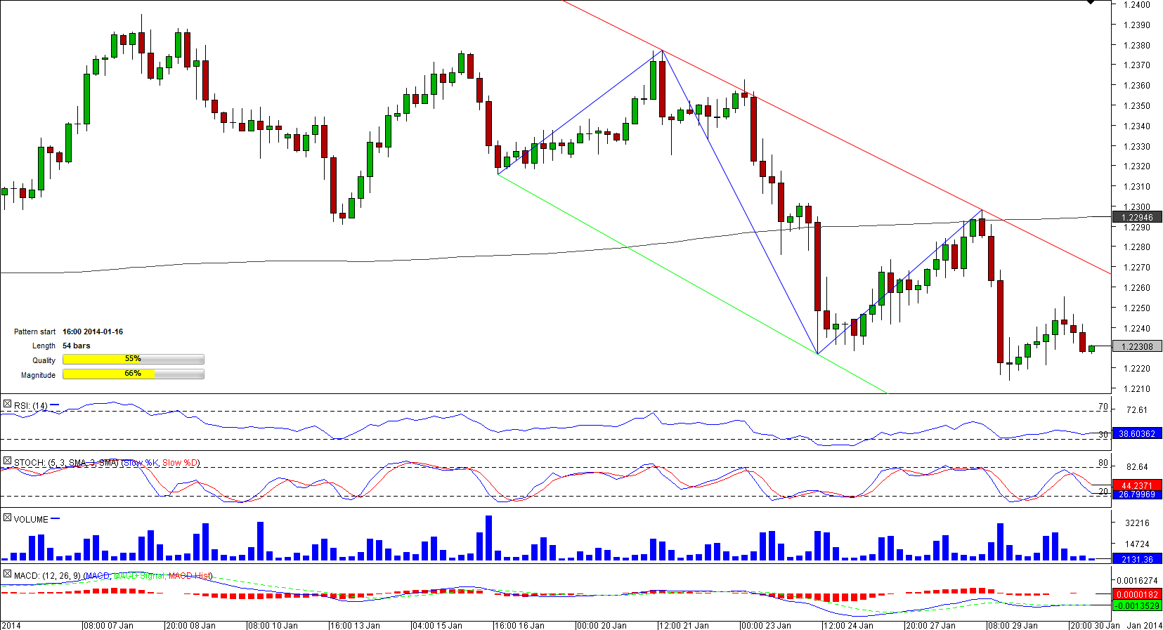 A rally of EUR/CHF observed in the second part of December was followed by a sharp decline. Whilst falling, the pair has been locked in the corridor created by two downward sloping lines that have been restricting the pair's moves for 216 hours.