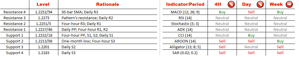 At the moment, EUR/CHF is faltering above a one-month low of 1.2213, and may dive below this mark in the hours to come as more than 60% of traders are bearish on the pair. To confirm this, EUR/CHF has to break through a bunch of support levels at 1.2219/04 (daily S1, S2) that if overcome will push the level of 1.2183 (daily S3) to the fore.