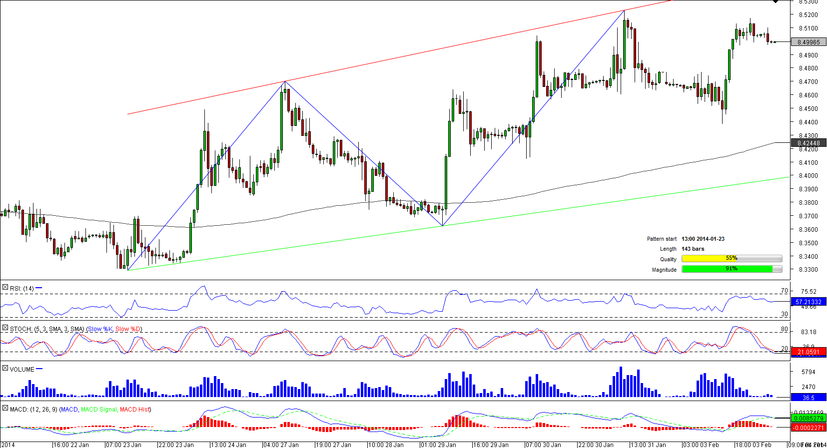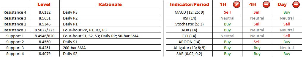 After swinging between small gains and losses for more than a month started in mid-December, EUR/NOK was trapped by two upward sloping lines that locked the pair in more than a thousand-pips wide trading range. Now the pair is attempting to re-approach the recent peak at 8.5223, a one-month high. To succeed the currency couple has to surpass the bunch of resistances at 8.5022/198 (four-hour pivot point, four-hour R1, R2, R3) that will open the way for the recent peak. In fact, if the pair manages to penetrate the one-month high it may target 8.5346 (daily R1) and then escalate to the pattern's resistance.