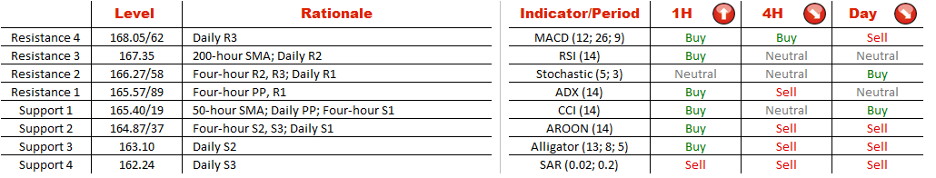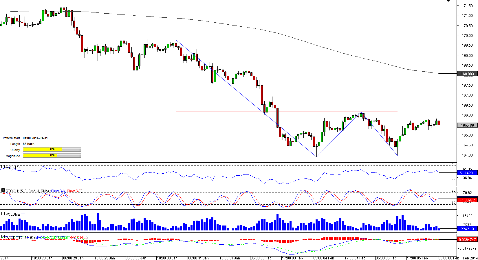 At the moment, the pair is locked between the 50-hour SMA at 165.38 and the neck-line of the 86-bar long double top pattern. However, GBP/JPY is likely to break these chains before long by penetrating the pattern's resistance and breaking out of the pattern. This view is reinforced by the SWFX data showing that almost 59% of all orders are placed to buy the pair.