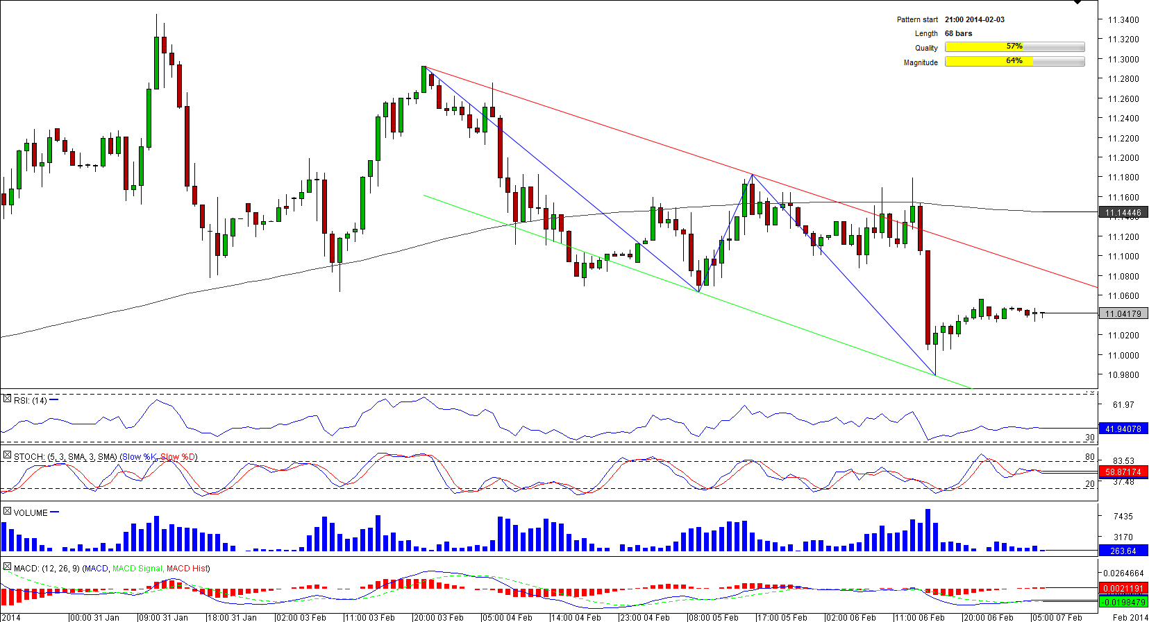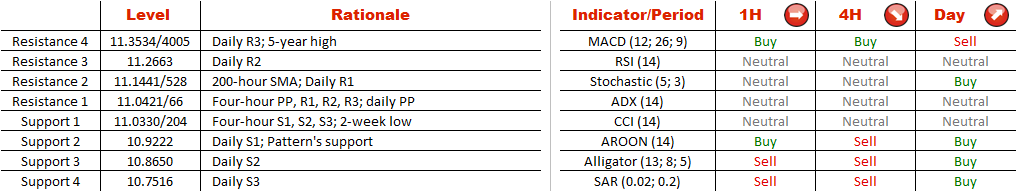 At the moment, the currency couple is vacillating near a two-week low of 11.0308; however, if the pair overcomes a cluster of resistances at 11.0511/665 (four-hour R1, R2, R3; daily PP) it is likely to catch momentum and may even attempt to target the pattern's upper boundary at 11.0944. At the same time, technical indicators are mixed, being bearish in the medium-term and bullish in the long-term.