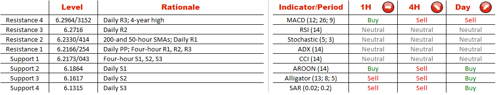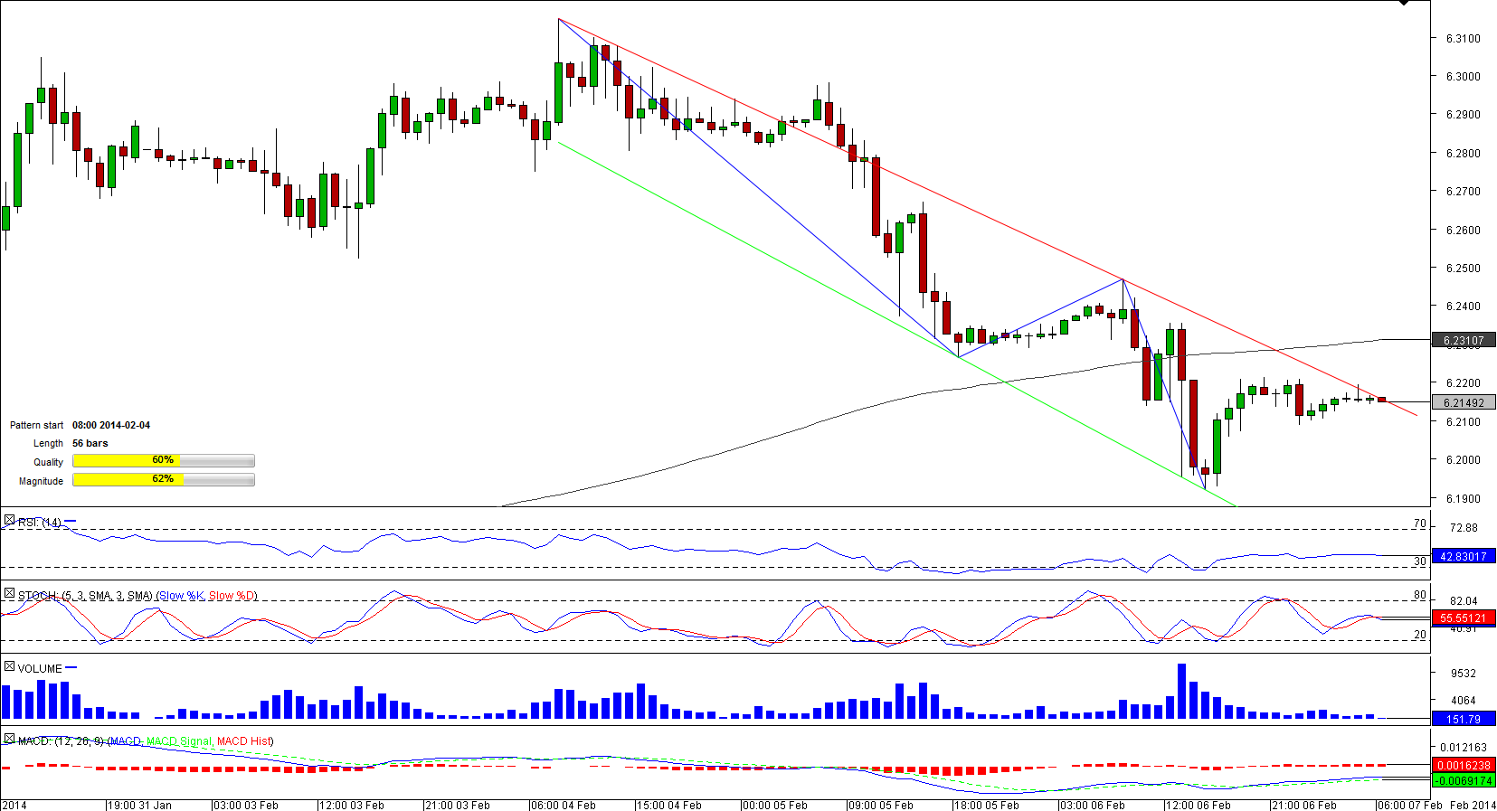A stab to a four-year high of 6.3152 sapped USD/NOK energy and forced it to slide from this peak at an accelerating pace. The pair lost more than 1,200 pips within three days and may extend its decline in future given the disposition of its SMAs. The 50-hour SMA is unremittingly approaching the 200-hour SMA and is likely to dive below the long-term SMAs in the following hours thus adding selling pressure at a time when the pair is attempting to consolidate above the upper limit of the tunnel. If the pair succumbs to the downside pressure, the recent breakout is likely to appear false and the pair may be again locked by the tunnel's boundaries.