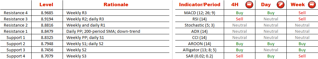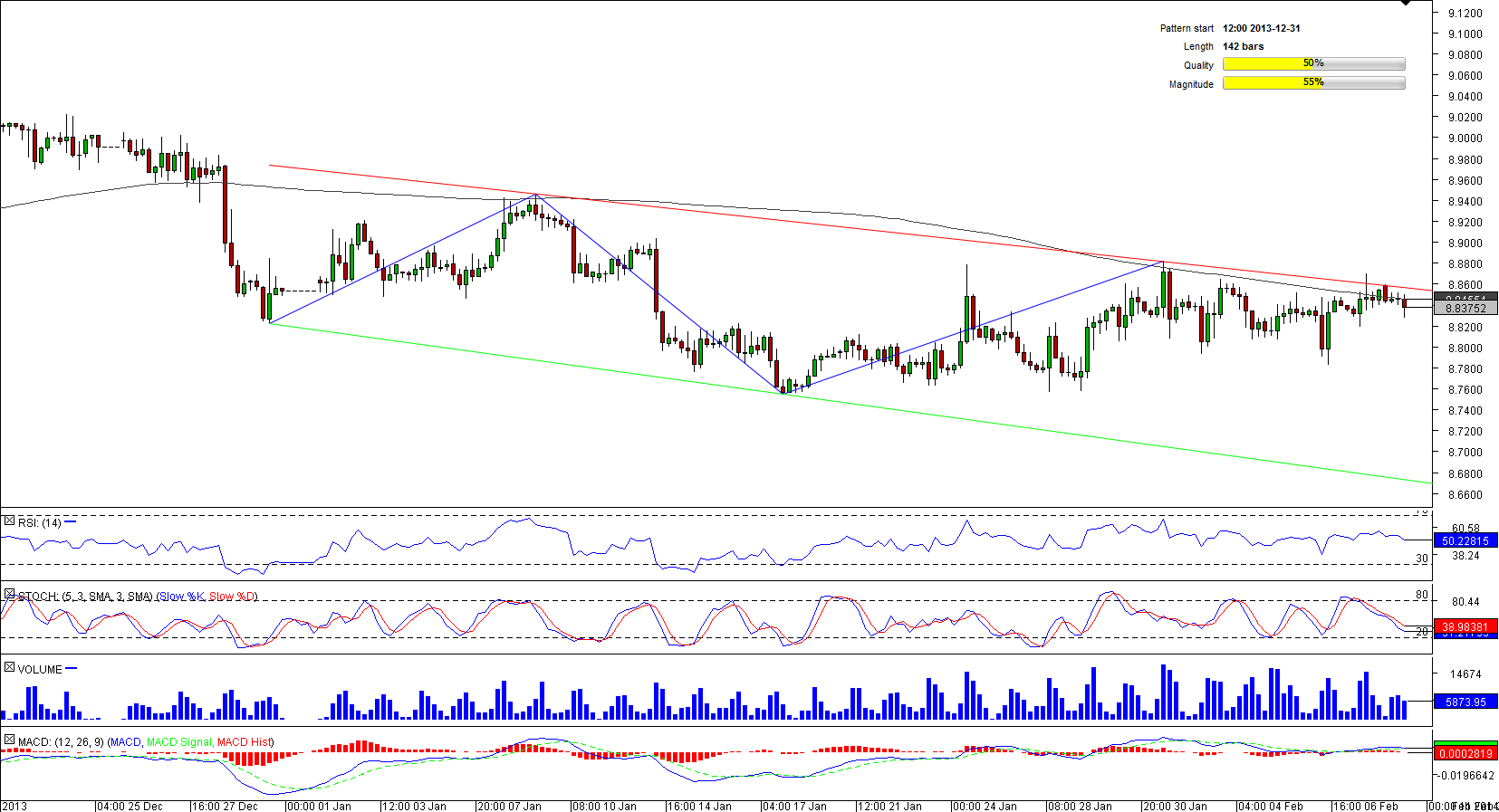Right now the price is fluctuating just below the upper trend-line, which creates formidable resistance at 8.8479, together with the weekly pivot point and the 200-period SMA. Accordingly, it is likely that the Euro will soon resume falling, potentially until it hits the down-trend support line at 8.67. The bearish scenario is shared by an overwhelming majority of the SWFX market participants, considering that 73% of open positions at the moment are short.