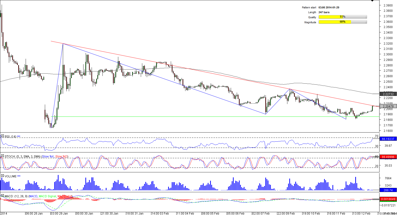 The 247-bar long triangle originated on January 29 and now the pair is unremittingly approaching its apex, suggesting that the breakout is looming. Despite overall bearishness of the triangle, market players are modestly bullish on the pair, with 57.14% of positions being long. This may signalize that upward exit is possible.