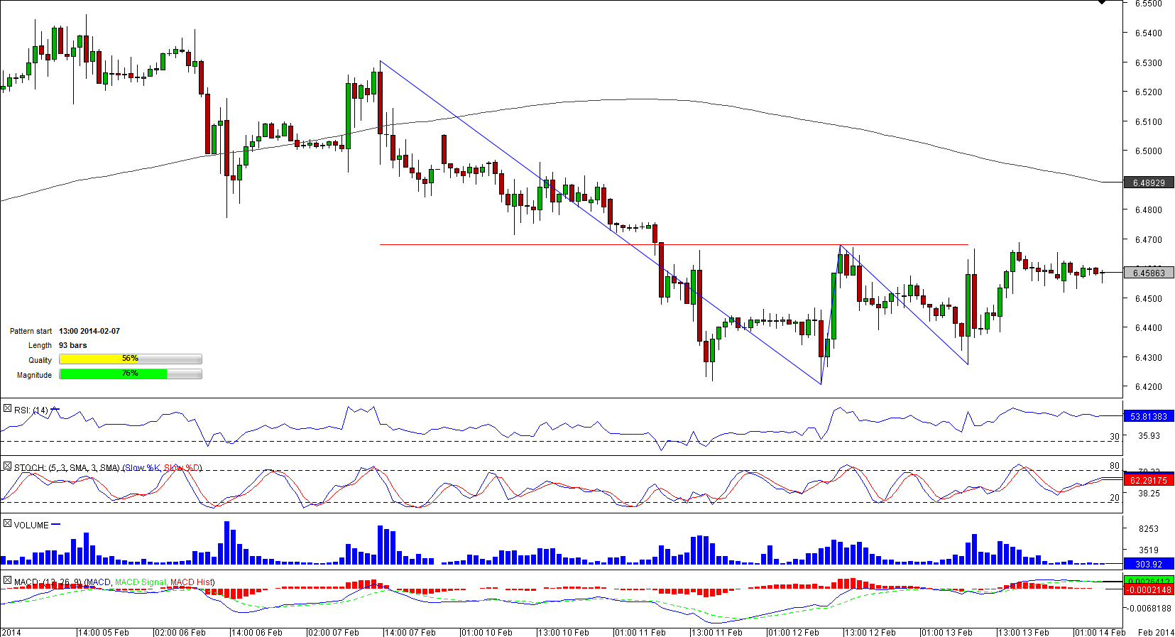 The currency couple has already touched a three-week low, the pattern's bottom, two times and now is indefatigably approaching the neck-line at 6.4679 that represents the key level above which the pair may enjoy an accelerating appreciation. According to the SWFX data, USD/SEK is likely to surpass this formidable resistance before long as more than 83% of traders are bullish on the pair.