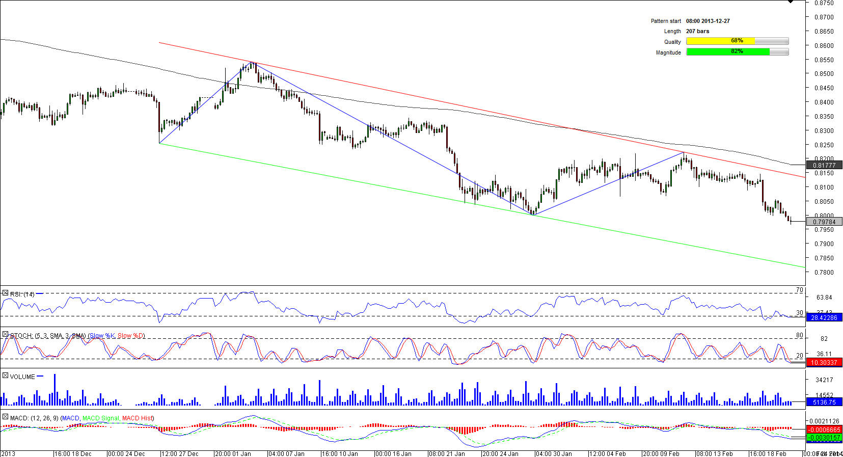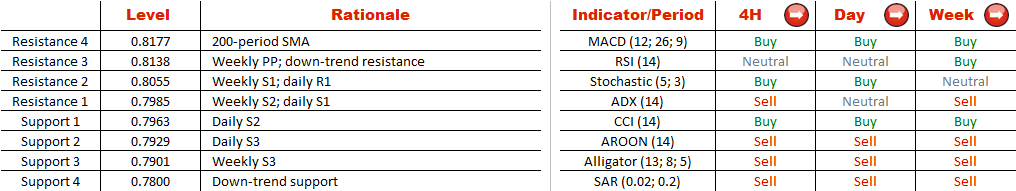 A channel down pattern on the four-hour chart of CAD/CHF bears a striking resemblance to the bearish corridor observed on the Euro-Swissie chart. However, signals of the technical indicators, especially on the shorter-term time-frames, and sentiment of the traders are different. Still, here the Swiss Franc is also expected to outperform its counterpart and pull loonie's price down to 0.78. There the currency pair is supposed to meet the down-trend support line and commence a bullish correction. At the same time, the rate should not spike above the resistances at 0.8138 and 0.8177, which are created by the weekly PP, 200-period SMA and the falling trend-line.
