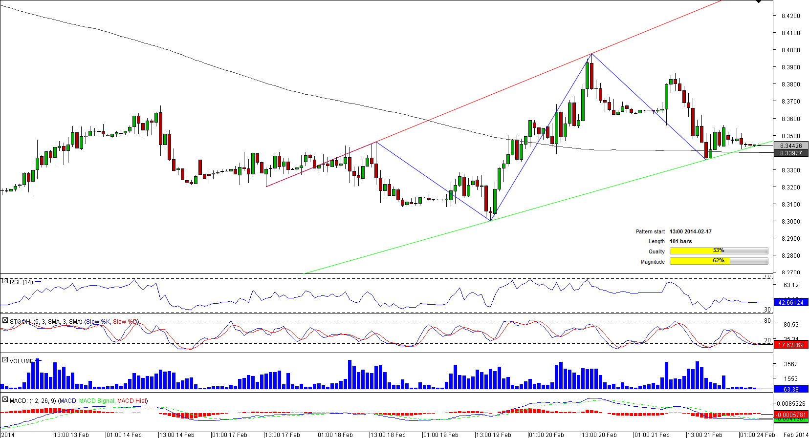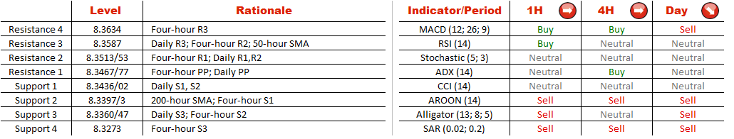 Now the pair is sitting at the lower limit of the pattern at 8.3442 and a bearish breakout seems possible as almost 90% of market players bet on depreciation of the currency couple. If traders' outlook materializes the pair may drop to the level of 8.3402/347 (200-hour SMA; daily S2, S3; four-hour S1, S2) that is likely postpone an accelerating decline.