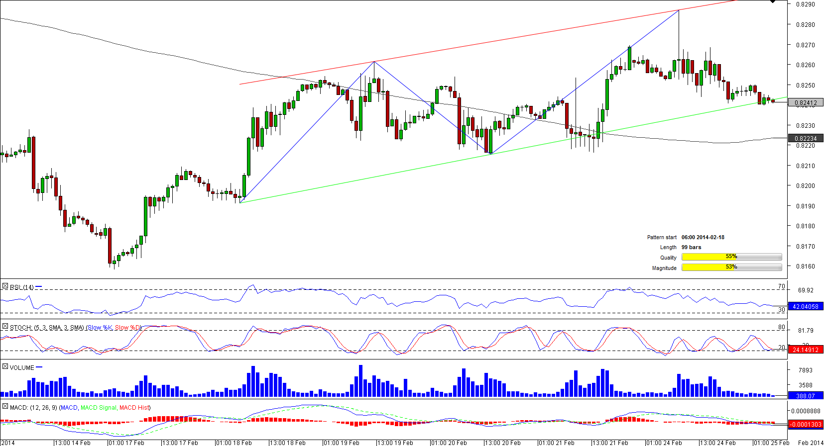 Having plunged to a one-year low of 0.8157, EUR/GBP changed direction and commenced a recovery, the biggest part of which has been developing between two upward sloping lines.