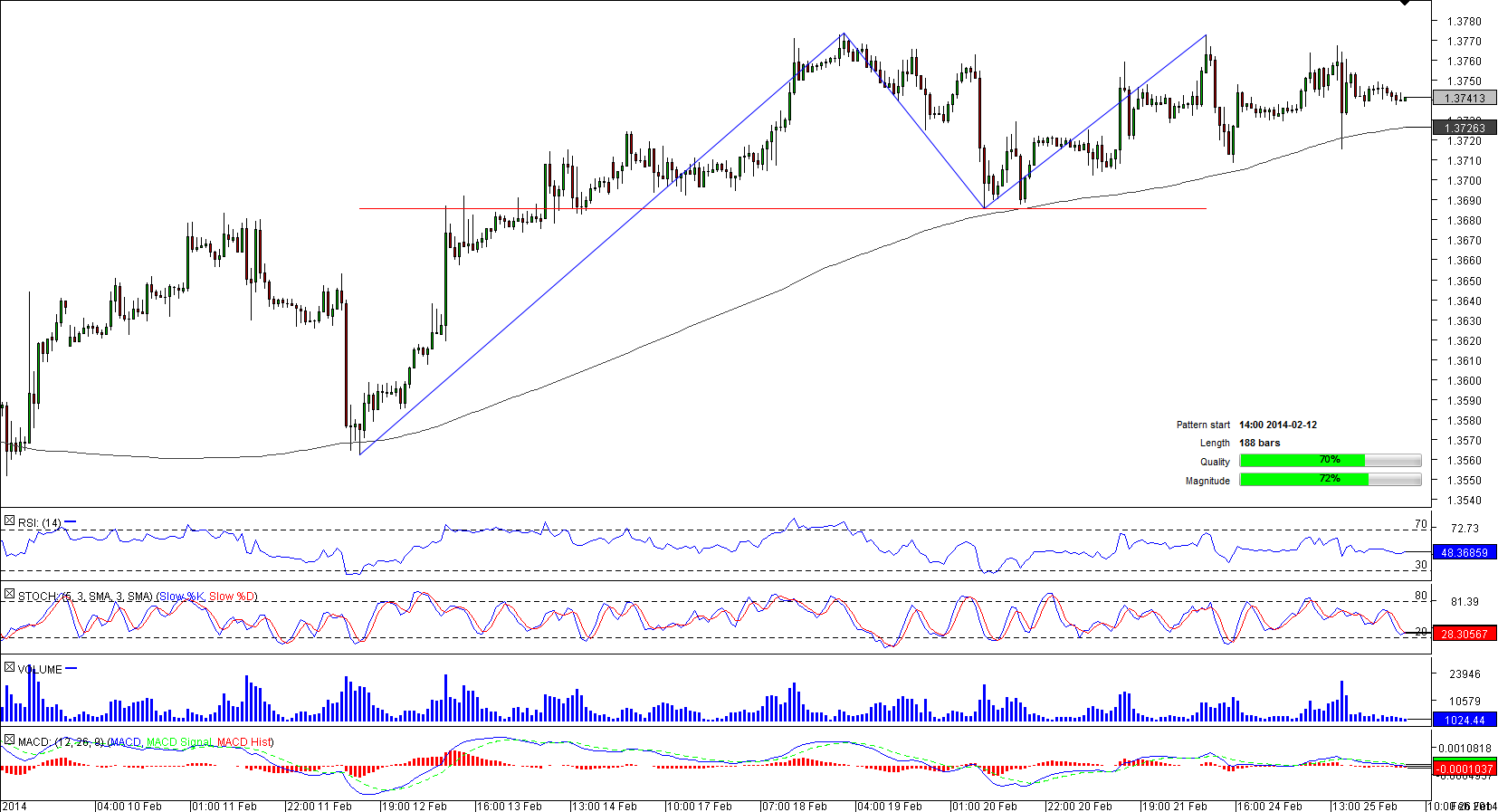 EUR/USD has been following an upward trend since mid-February when the instrument started to shape a double top pattern. The most bullish part of the pattern was ended at a six-week high of 1.3773. Although the pair has already started a retreat from the second peak of the pattern, it is still well-above the neck-line sitting at 1.3685. The main hindrance for a further drop is the 50-hour SMA at 1.3740 that has been preventing a decline for more than two days and may continue to doing so in the hours to come. Meanwhile, the SWFX data fails to shed light on the pair's future direction, indicating a proportion of long to short positions is almost 1:1.