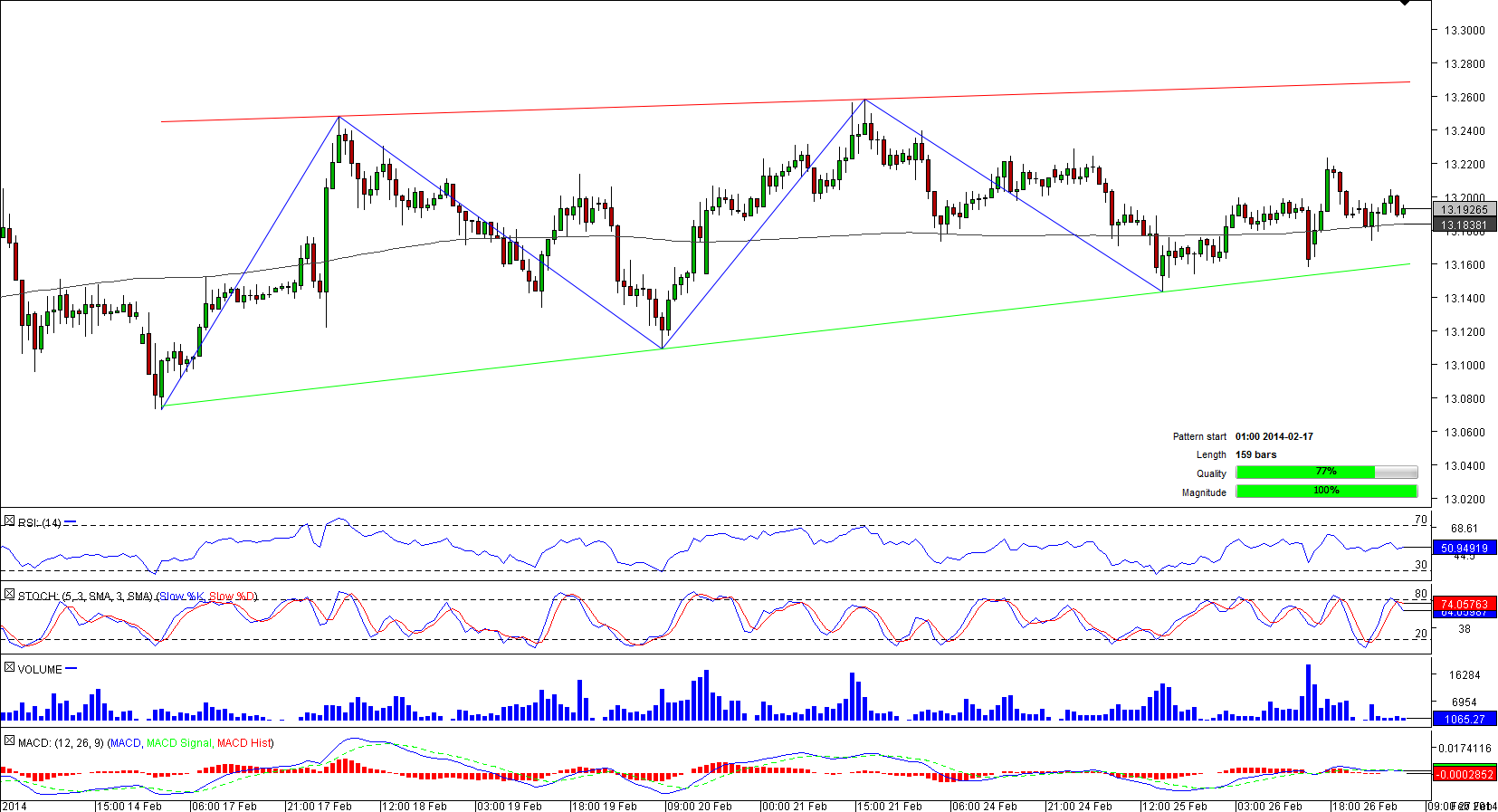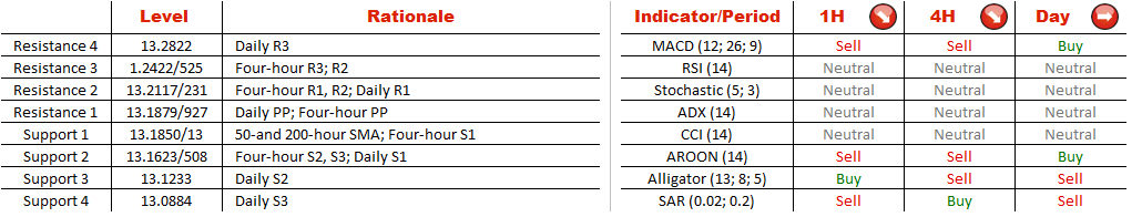 At the moment, the pair is hovering above the short and long-term SMAs, albeit slightly. In fact, disposition of the SMAs is fuelling worries about a possible sell-off since the 50-hour SMA at 13.1854 is on the verge of diving below the 200-hour SMA at 13.1841 thus forming a ‘death cross'.