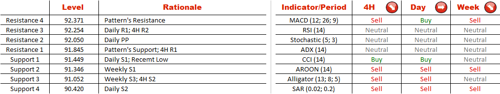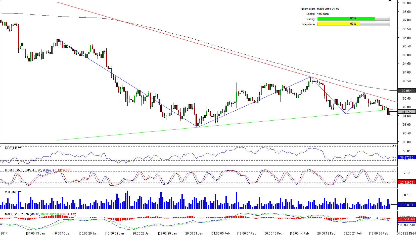 A 176-bar long triangle was formed by CAD/JPY on a 4H chart. The pattern, however, is moving to its apex as both trend lines will converge on March 3, while the pair is already trading below the lower boundary. At the moment of writing almost 66% of traders were holding short positions, supporting the case of pair's depreciation. Moreover, from the upside the pair is facing a strong resistance represented by pattern's upper boundary and a 200-period SMA that both were limiting pair's appreciation recently. Technical indicators also support bearish outlook, hence, next key support is located at a weekly S1 at 91.346. In case it is breached, 90.814 will be put on the map.