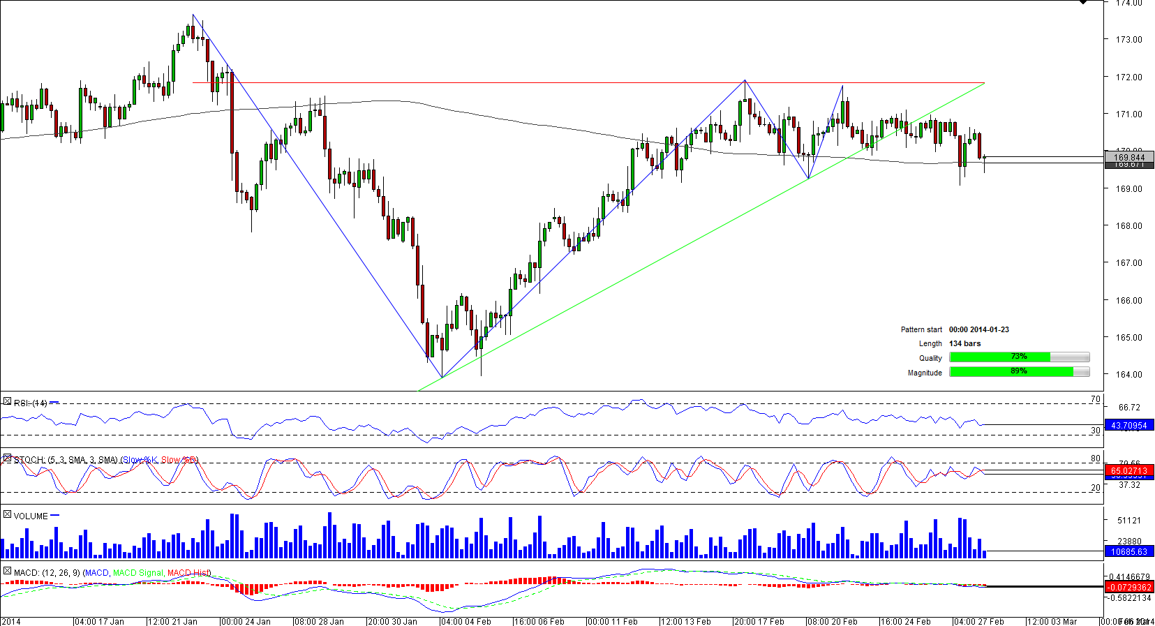 GBP/JPY has been trading sideways since it broke through a 134-bar long ascending triangle on February 25. The pair was capable of withstanding heavy downside pressure thanks to the 200-bar SMA that is meandering at 169.67. At the same time, the upswing of the pair also was restricted as the 50-bar SMA at 170.51 was preventing any attempts to advance. Given bullishness on the market-almost two thirds of traders bet on appreciation of the pair-GBP/JPY may go out of the trap created by its SMAs and confirm that an accelerating decline usually following a bearish breakout will not happen this time.