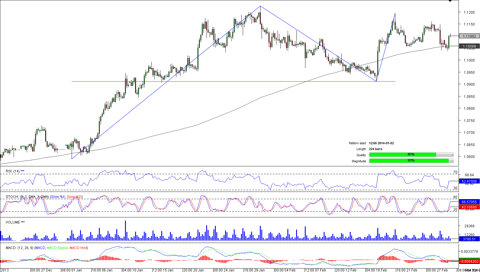 A 224-bar long double top pattern was formed on January 2 and after reaching a high of 1.1224, the pair started moving sideways. Despite Friday's strong movement to the downside that pushed the pair below the 200-period SMA, the outlook is bullish. There are several reasons behind such a suggestion, including technicals on a daily and weekly chart, while 61% of Dukascopy traders are holding long positions, expecting the greenback to appreciate against the loonie. Pair's depreciation should not be excluded, as aggregate indicators on a 4H chart and 57% of pending orders are supporting the case of a move to the pattern's support.