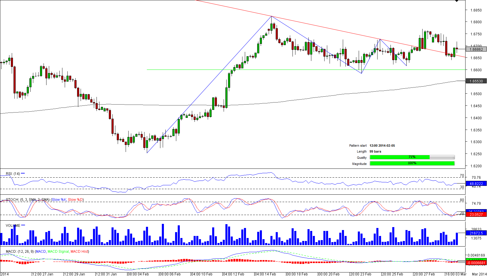 Even though a descending triangle pattern was already penetrated, the pair still presents a great opportunity fro traders, as throwbacks are considered to be more attractive than breakouts. After reaching this year's high at 1.6823 on February 17 the pair began moving sideways, however, a move back to this level is expected, as more than 60% of pending orders in a 100-pip range are placed to buy the pair, while technical indicators on a daily chart are sending ‘buy' signals, also supporting this idea. However, before reaching a weekly R1, the pair will have to penetrate a weekly and daily PP at 1.6696 and a daily R1 around 1.6726. For now, the pair still can move sideways.